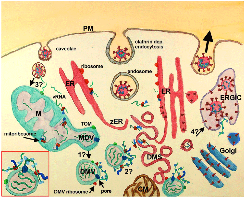 In the complementary scenario proposed in this work, DMV are shedded from mitochondria, through a mechanism similar to that described for double-membrane MDV, and or asymmetric mitochondria fission, known to be potentiated after mitochondrial stress. Whether MDV require several transforming steps to become DMV, or if these compartments are essentially the same with viral proteins included needs further investigation (question mark 1). DMV have double-membrane spanning pores (dark blue) in which nsp3 is inserted along with other unidentified molecules. These pores mediate the export of vRNA to the cytoplasm, which complexes with N protein outside DMV. Exported vRNA may be translated immediately by ribosomes located in the external membrane of DMV (question mark 2). Interestingly, some MDV have been shown to carry mitochondrial proteins of the IMM, MOM, and mitochondria matrix, which could be also present at DMV (green dot at MOM, MDV/DMV outer membrane). In this complimentary scenario, a critical question is how vRNA accesses mitochondria (question mark 3). It is possible that vRNA once in the cytoplasm is translated at MOM ribosomes, or that it is translocated into mitochondria through the TOM complex. Alternatively, vRNA could reach mitochondria through the fusion of caveolae with endocytosed SARS-CoV-2, although it is not clear whether coronavirus can follow this pathway. Finally, an intriguing possibility, that could be critical, is whether DMS, which are induced by viral proteins most probably synthesized nearby the ER from where they are derived, may transform into vesicles with viral particles. This possibility is supported by the synthesis of viral proteins at DMS and would require that vRNA is packed inside, which seems feasible because protein synthesis at DMS implicates the presence of vRNA. The lack of de novo synthesized vRNA at DMS indicates that vRNA synthesis does not happen there, but does not rule out the presence of vRNA within DMS. Inset, red square left bottom: A close-up of a DMV with vRNA in its interior (3 green stripes), with one vRNA being exported by the double-membrane spanning pore (dark blue at DMV membranes), complexing with the N protein (light blue). This exported vRNA could be translated in situ at DMV ribosomes (red at DMV external membrane). Peptides synthesized by DMV ribosomes are shown attached in blue and the green dot at DMV represents mitochondrial molecules located at DMV. Abbreviations: CM-convoluted membranes; DMS-double-membrane spherules; DMV-double-membrane vesicles; ER-endoplasmic reticulum; ERGIC-ER-Golgi intermediate compartment; M-mitochondria; PM-plasma membrane; TOM-translocase of the mitochondrial outer membrane; VP-vesicle packet (not shown); vRNA-viral RNA; zER-zippered ER.