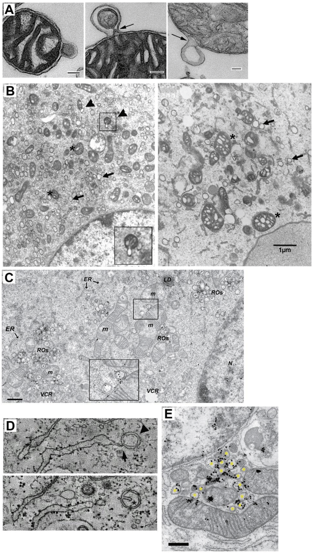 A TEM of three isolated mitochondria from bovine heart shedding double membrane vesicles (bar=500 nm in first panel and =100 nm in panels 2 and 3). (Taken ftom 29). B TEM analysis of mitochondria morphology and DMV formation in infectious clone virus (icv)-infected cells (derived from coronavirus murine hepatitis virus; MHV). This icv has a mutated nsp4-N258T that results in temperature sensitive viral replication. As observed, after 5.5 h p.i at the pemissive temperature, DMV are evident (arrows) and some mitochodria (asterisk) are associated with shedded vesicles (left panel, arrowheads and inset). Interestingly, if cells are left at the non-permissive temperature the last 2 h. (right panel), mitochondria appear swollen with enlarged cisternae, and accompanied by increased localization of nsp3 and nsp4 at mitochondria (not shown).(Modified from 15 with permission) (bar=1000 nm). C TEM and autoradiography of de novo synthesized vRNA in SARS CoV infected-Vero E6 cells at 7 h p.i. As observed, some DMV are closely located to mitochondria, showing both vRNA label within. Interestingly, vRNA label in DMV and mitochondria are neighboring (inset) (Modified from 19). D Electron tomography images of an Infectious Bronchitis Virus-infected cell showing a DMV (arrowhead) connected to the ER (arrow) (upper panel). In a different plane (lower panel), the same DMV shows a cisternae-like arrangement of the inner membrane (asterisk), that resembles those of mitochondria, hinting the putative mitochondrial origin of DMV (Modified from 23 with permission). E TEM and autoradiography of de novo synthesized vRNA in SARS-CoV-infected Vero E6 cells at 12 h p.i. It can be observed that DMV (asterisks) are densely labeled with vRNA signal. Notably, a couple of mitochondria are also labeled for vRNA, but importantly, this label is polarized in both mitochondria near the membrane towards the DMV cluster. Intriguilgly, within this pool of DMV, a degenerated mitochondria-like structure is observed (spark at the center), perhaps resulting from extensive DMV shedding (bar=500 nm) (Modified from 19).