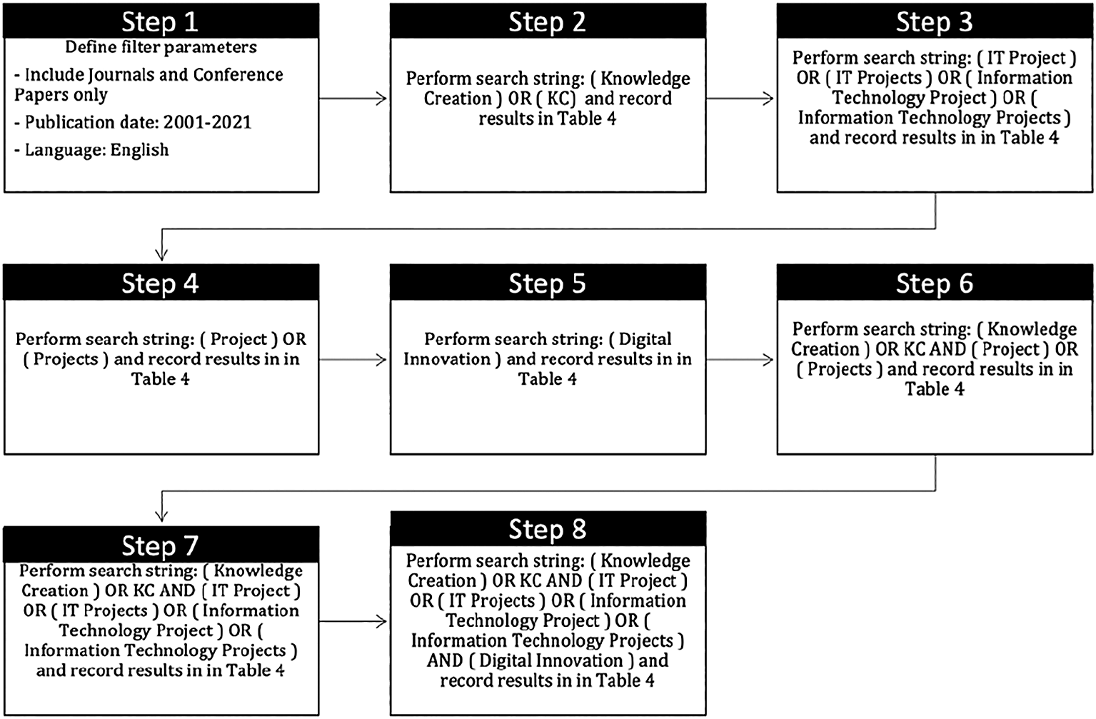 We focused on two main research areas: (1) KC, (2) IT projects, and (3) DI. For the first area, we included terms such as ‘knowledge creation’ and ‘KC’ (abbreviations). The next key terms used were ‘project’, ‘IT project’, ‘IT projects’ and ‘digital innovation’. Each of these keywords was searched with the keyword ‘Knowledge creation’ individually. The search was subsequently extended by adding more keywords. Table 2 presents the keyword sets used for this research.