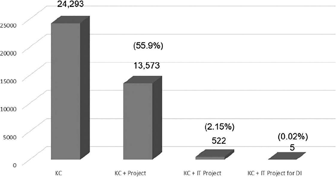 Figure 5 provides a bar chart to highlight the research gap according to the keyword search of KC, KC + Project, KC + IT Project and DI. The KC papers amounted to 24,293. The fractions of the total KC papers can be seen as 55.9% (13,573) on KC in projects, 2.15% (57) on KC in IT projects and 0.02% (5) papers were related to KC in IT project for DI. Figures 5 and 7 were able to meet the study's objective and indicate KC-IT research gaps.