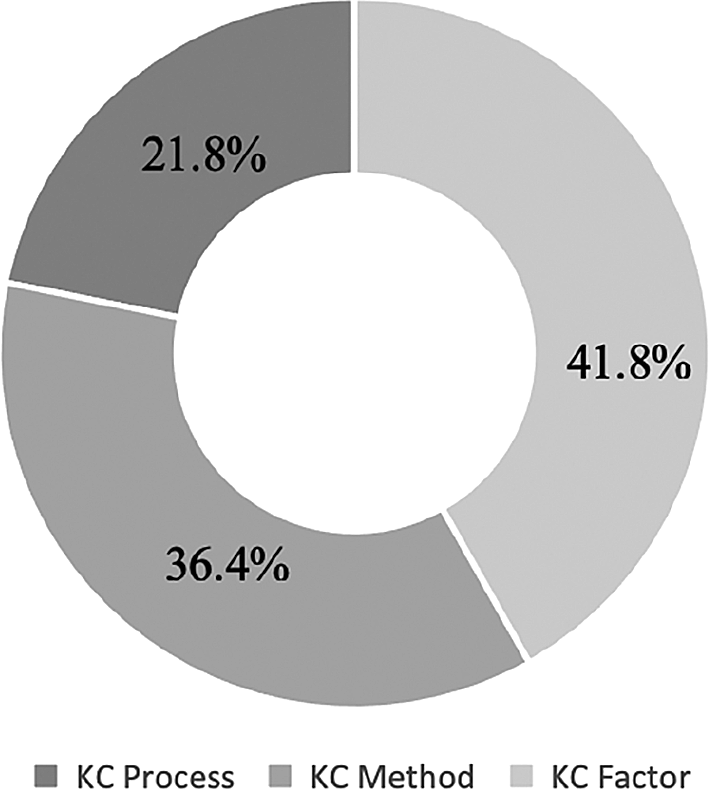 The KC + IT Project papers are divided into three sub categories: KC Process, KC Method and KC Factor. The number of units is indicated in the parentheses, and a pie chart is presented in Figure 6 to reflect the percentages. Figure 6 depicted the objective of the study to understand the current view of the KC-IT literature in terms of sub categories. Figure 4 reveals that 41.8% of the research papers are sub categorised under the KC Factor and 36.4% under the KC Method. Meanwhile, 21.8% papers were related to the KC Process.