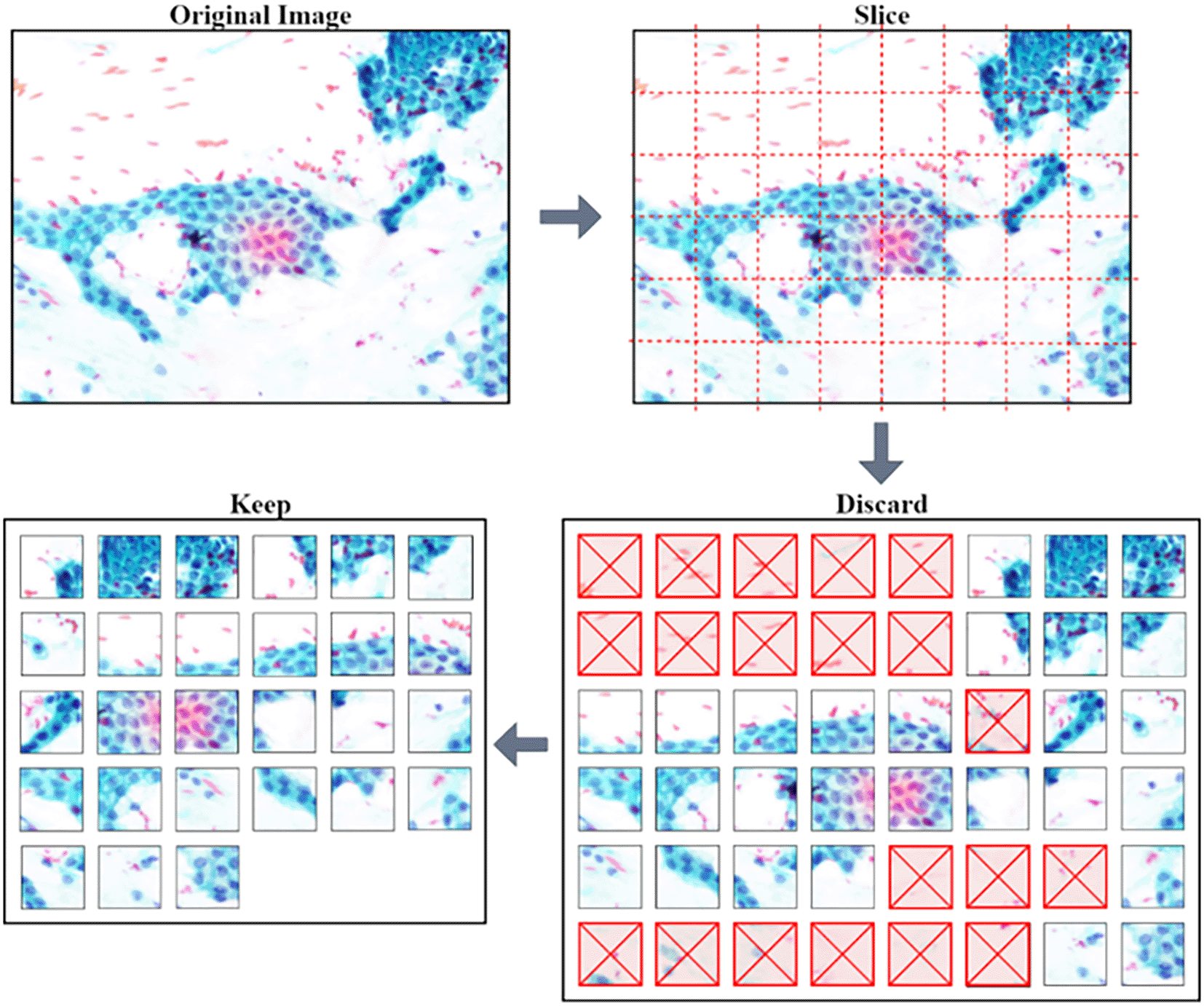 The pre-trained models require a low dimension and square image for training and making predictions. The squared slicing method is used where smaller patches with approximately 200 × 200 pixels of non-overlapping regions are sampled from the original images. Further processing was done to remove unwanted patches, as shown in Figure 2.