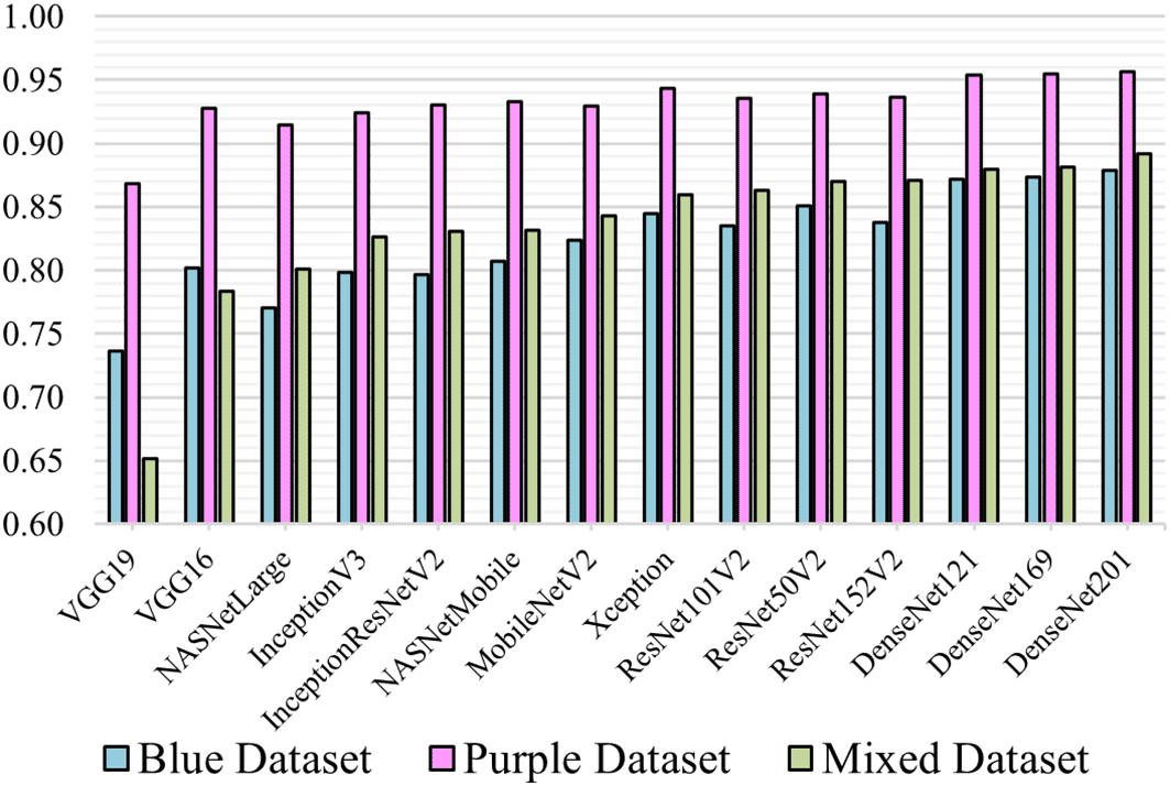 The overall performance results of all 14 different transfer-learning models proposed for this experiment are presented. Each model was trained with the 3 datasets and 5-fold cross-validation. Figure 3 illustrates the overall performance in terms of mean f1-score.