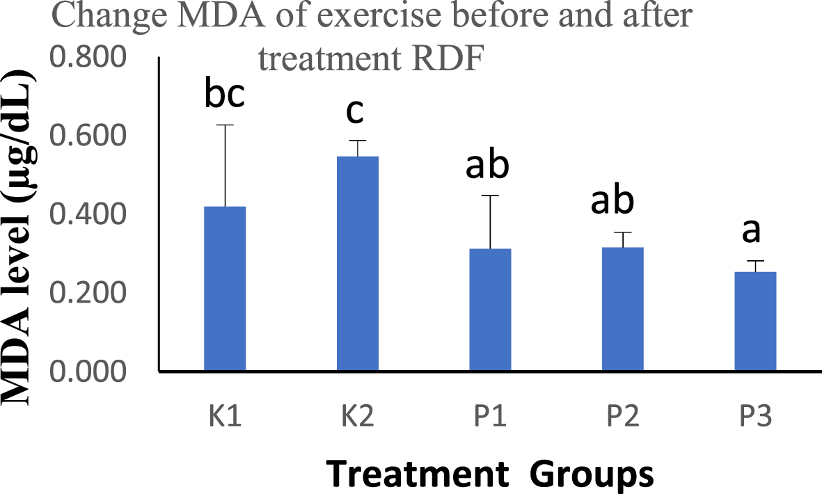 The free radicals in the body are balanced with endogenous defense mechanisms, and the body will produce antioxidants with an anti-free radical effect. In this study, the K2 group performed physical activity and SOD levels were 0.4632±0.2449 ng/mL. There was an increase in SOD levels in the K1 group (0.8647±0.1744 ng/mL) that did not perform physical activity. The increase in SOD continued with RDF extract treatment in groups K1 (1.3499±0.1359 ng/mL), P2 (1.9370±0.0236 ng/mL) and P3 (1.9521±0.0239 ng/mL). The three groups were given RDF treatment and showed significant differences (p<0.05), analysed with the One-Way ANOVA test (Table 3 and Figure 2).