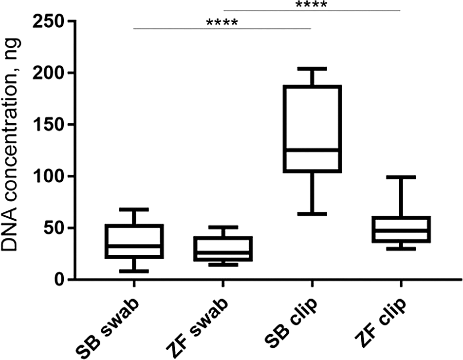 This data is taken from Breacker et al. (2017). Fin clipping led to more DNA being collected in both species compared to skin swabbing. The same fish were used in both procedures. n = 10 zebrafish and n = 10 sticklebacks. One-way ANOVA followed by Tukey’s post hoc test. **** = p < 0.001. SB = stickleback and ZF = zebrafish.