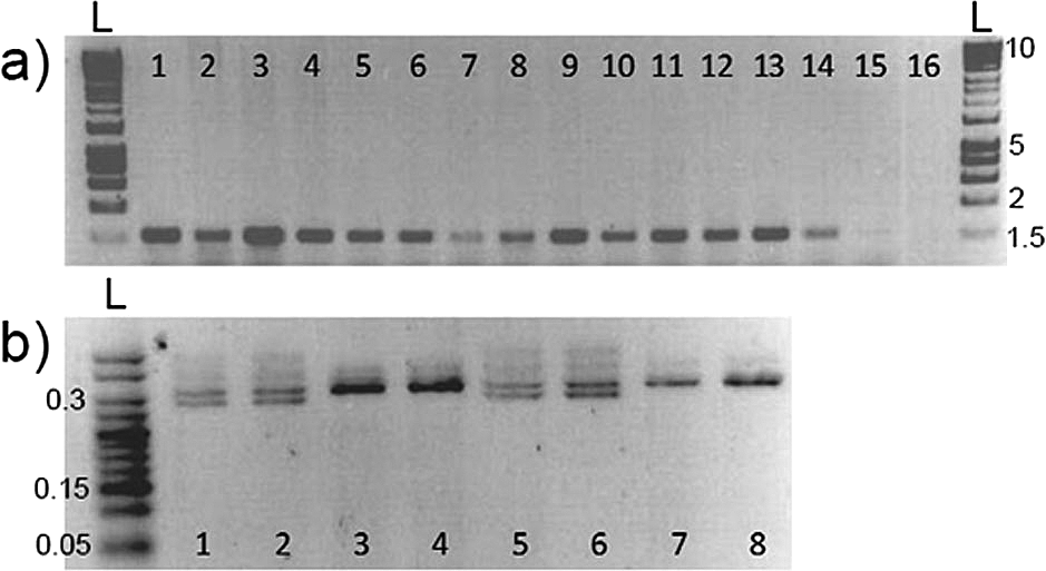 (a) Amplification of mitfa from zebrafish fin clips, swabs and size range; 1-3 = fin clips, standard length (measured from nose to beginning of tail fin) adults, at 6 months old; 4-6 = swabs standard length adults, at 6 months old; 7-9 = swabs from 20 mm standard length adults; 10-12 = swabs from 35 mm standard length adults; 13-15 = swabs from 50 mm standard length adults; 16 = blank. n = 15 zebrafish, one fish per band. The amplified band has a size of around 1,500 bp. (b) Amplification of Isocitrate dehydrogenase from stickleback swabs and size; 1-2 = 50 mm standard length adult male swabs; 3-4 = 50 mm standard length adult female swabs; 5-6 = 20 mm standard length adult male swabs; 7-8 = 20 mm standard length adult female swabs. n = 8 sticklebacks, one fish per band. Females produce a single 300 bp band, whereas male fish produce two bands that are 270 bp and 300 bp. L marks the position of the 1 Kb DNA ladders, and the numbers on the right-hand side show ladder band sizes in Kb. Reproduced with permission from Breacker et al. (2017).
