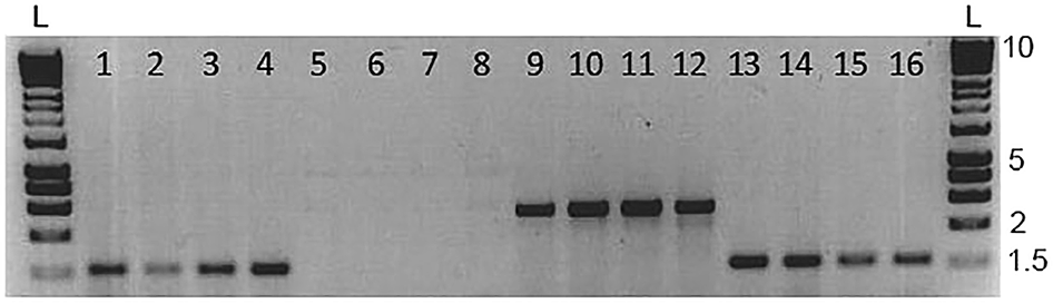 Skin swabbing appears to be a suitable technique to collect DNA from small laboratory fish without the need to excise fin tissue (Tilley et al., 2020; Breacker et al., 2017). We investigated the potential for cross contamination of mucus samples when housing zebrafish in close proximity in a small aquarium. We created a group by mixing 10 AB wild-type and 10 Tg (vmat2:GFP) zebrafish and maintained them in a small 3 L tank overnight. Tg (vmat2: GFP) carry a green fluorescent protein (GFP) transgene that can be amplified by PCR (Wen et al., 2008) and have long ornamental fins allowing them to be distinguished visually from the AB wild-type animals. We first swabbed the AB wild-types and then the Tg (vmat2: GFP) fish, and we did not assess whether this order of collecting DNA might influence the results. We amplified both mitfa (a control gene that should be present in all animals) and the gene coding for GFP, which should be present in the transgenic carriers but not wild-type. Figure 3 shows a subset of four of these fish for clarity. As hypothesised, mitfa was present in both genotypes (Figure 3; lanes 1-4 AB and 13-16 Tg (vmat2: GFP)), whereas gfp was only present in the transgenic fish (Figure 3; lanes 5-8 AB and 9-12 Tg (vmat2: GFP)). This suggests that cross-contamination of mucus had not occurred when keeping fish at high density.