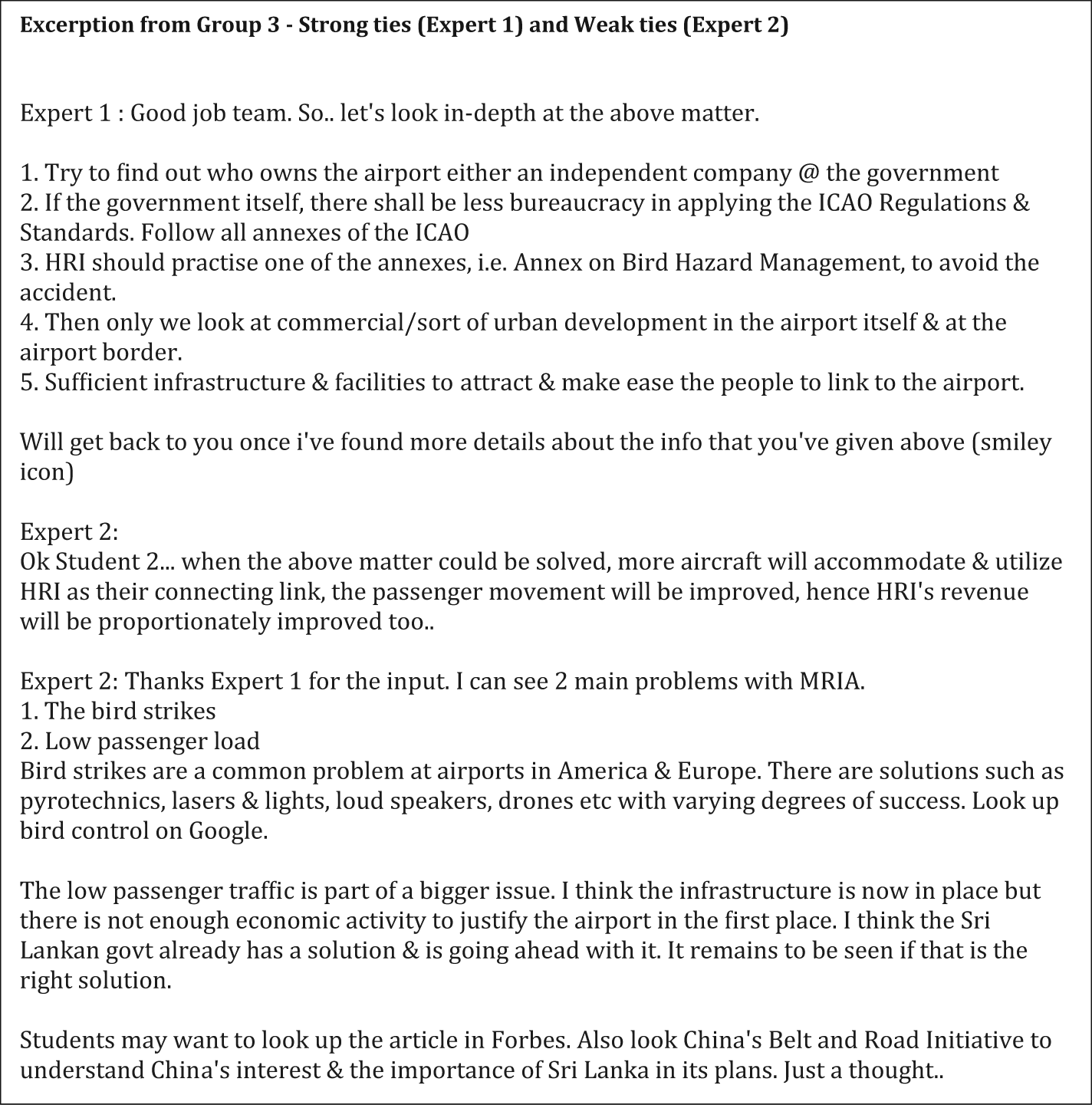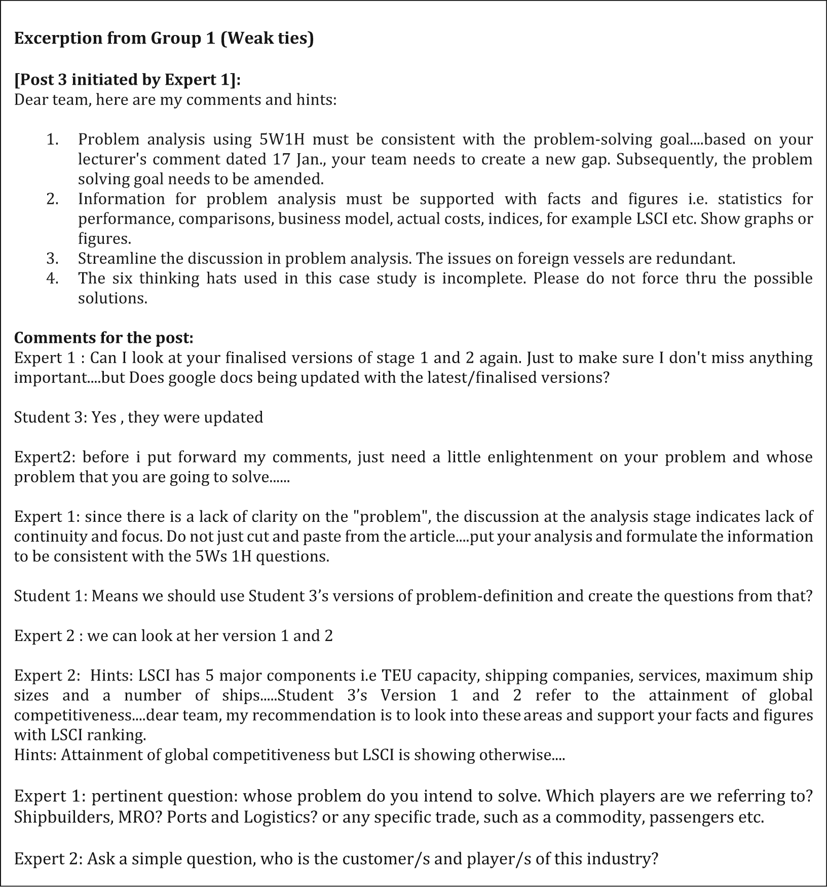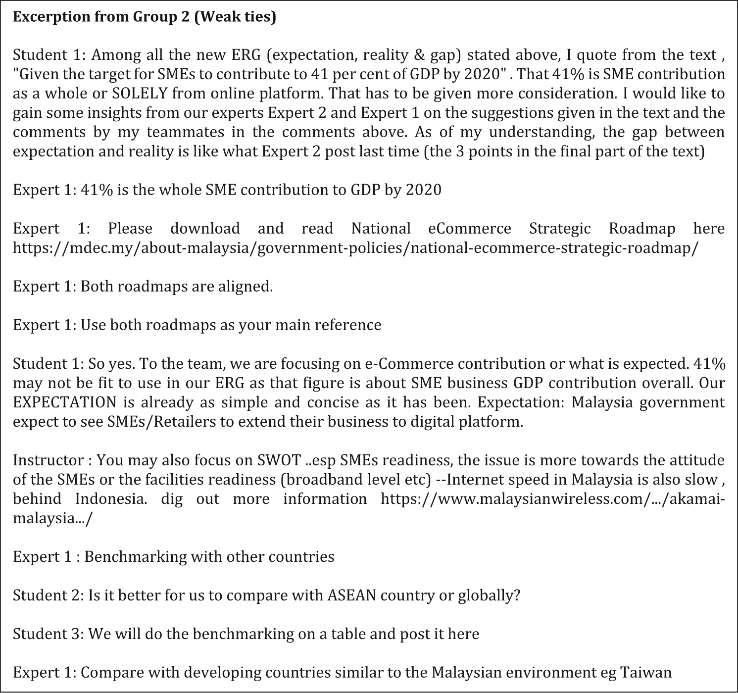 Figure 1 displays the network analysis based on the themes extracted from Facebook discussions. The weak tie experts in Group 1 (Figure 2) displayed a more accommodating approach and a sense of belongingness by using phrases such as “dear team” and “keep moving team”. Selby25 described this as the people preference style where this approach is seen as an effort to maintain harmony in the group. The experts respected the students' own pace of processing information as they required time to digest and internalise the meaning of the information presented to them by the students before responding. In contrast, the business experts from Group 2 (weak ties 2) adjusted their reasoning based on the information the students presented to them first. This sort of arrangement falls under the explorer style. The experts preferred the students exploring all possible options and presenting the latest information before guiding the students based on the materials presented (Figure 3).