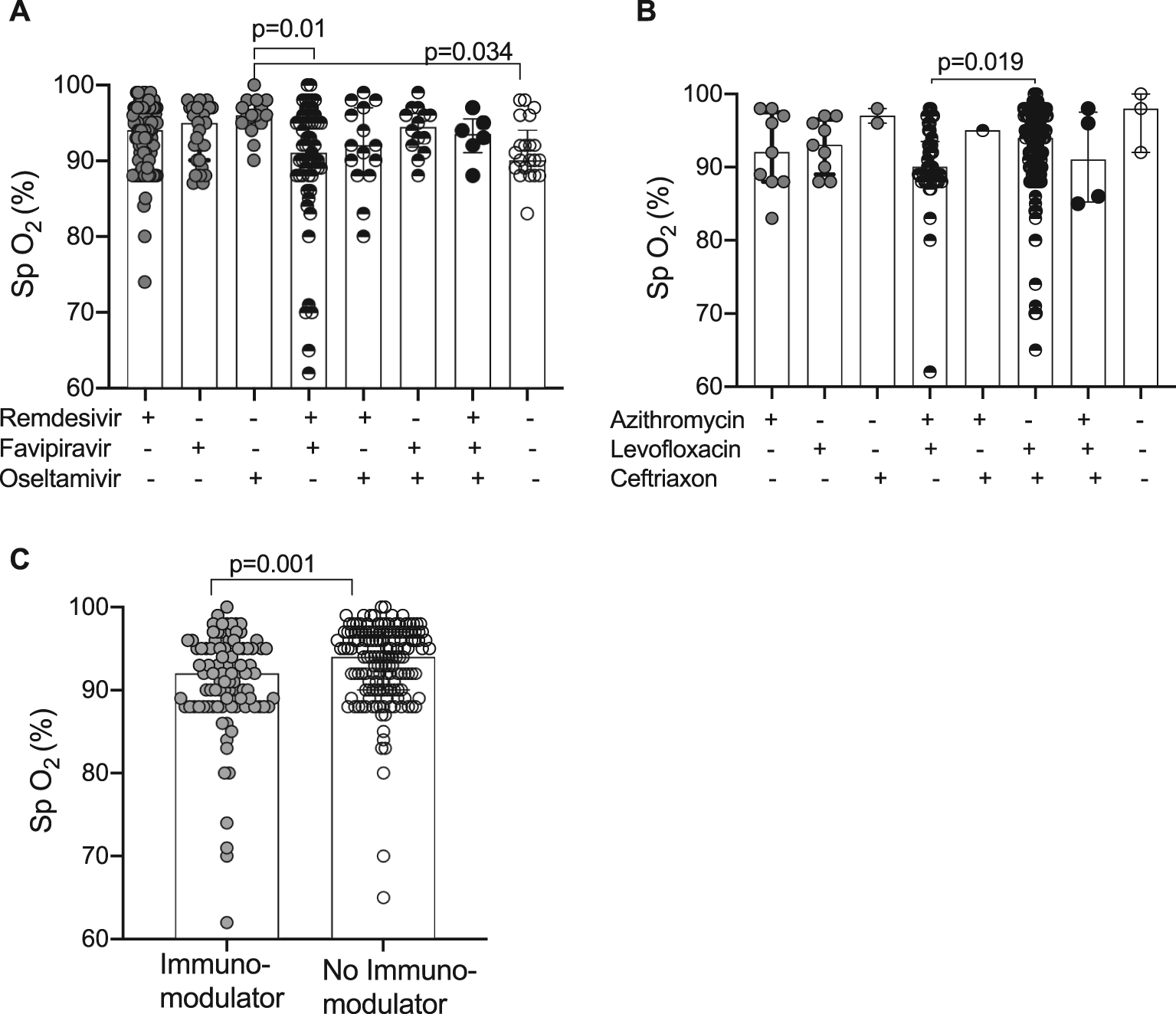 (A) Baseline SpO2 and the antiviral therapy using remdesivir, favipiravir, and oseltamivir in the various drug combinations. (B) Initial SpO2 and antibiotic combination of relevant azithromycin, levofloxacin, and ceftriaxone. (C) Immunomodulatory therapy using methylprednisolone, dexamethasone, and tocilizumab. Data are presented as median and interquartile range (IQR). Statistical differences were analyzed by Kruskal-Wallis and Dunn’s multiple comparisons (A, B) or Mann-Whitney test (C).
