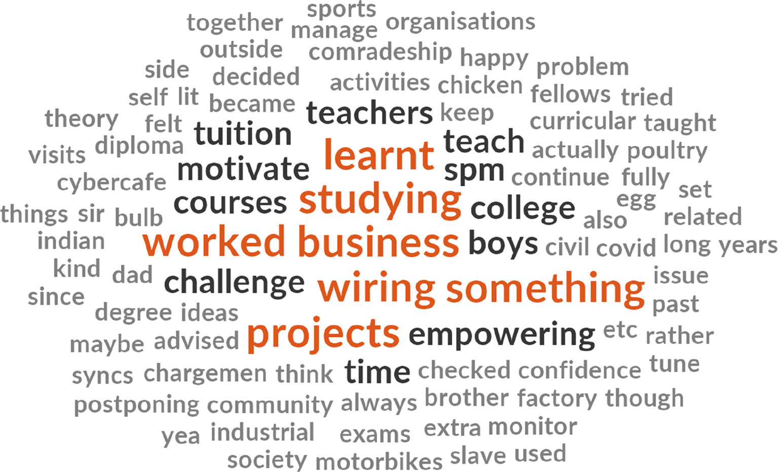 As to research question 2 on the proactive measures and their crucial value in the upliftment of B40 youth to eradicate poverty, six themes were explored and summarised in their respective Tables and/or Figures. Firstly, on challenges faced in B40 youth training and action plans. Figure 2 shows that approval, employment, teacher, study, parents, college, and students are keywords used in explaining the challenges faced in B40 youth training. The initial 137 items with synonyms themes that emerged were reduced to 111 items after the removal of non-thematic words. Policymakers believed that tracking employment of the B40 youth after the approval of the training programmes for training providers would be particularly challenging given that the B40 youth tend to leave their jobs within one or two weeks and are very much into business opportunities. The training providers find it challenging to obtain the students’ focus for around eight hours a day while facing complaints from parents about their children being back home late at night. However, they believe that a close relationship with the students, close monitoring and constant updates to parents tend to keep these issues at bay. Meanwhile, trainees find it difficult to understand lessons taught by their teachers and would be required to google further explanations because their tutor pushes them to do so. They also face challenges from their parents not in favour of continuing studies or undergoing training because it would take up time that could be used to earn income at random jobs. Secondly, on interests of the B40 youth group. Figure 3 highlights certain themes that emerge including learning, business, wiring works, hands-on project, teaching, and studying. The initial 117 items with synonyms themes that emerged were reduced to 91 items post-removal non-thematic words. Third, regarding types of training wanted or needed by the B40 youth group (refer to Table 4). Fourth, measures to identify and pool B40 youth participants for training (refer to Table 5). Fifth, the emphasis in governance framework on B40 youth (refer to Table 6). Sixth, strategic perspectives on strategic plans to maximise benefit and minimise challenges of B40 youth training programmes for employment, entrepreneurship, reskilling and upskilling (refer to Table 7).