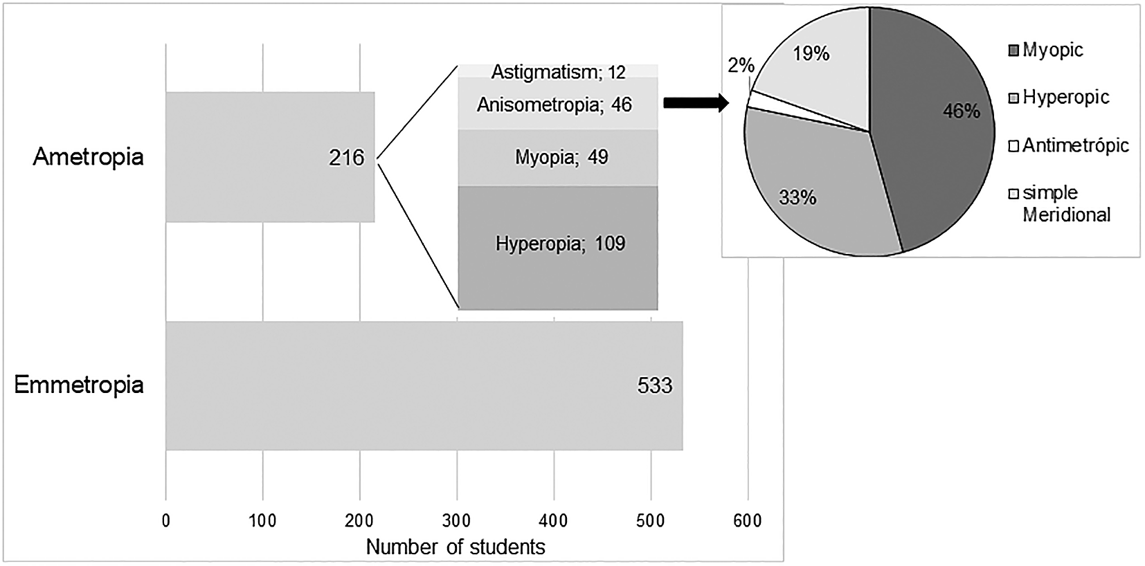 The participants were classified in emmetropes, myopes, hyperopes, astigmats or anisometropes, according to the average value of the auto refractometer. In order to carry out this classification, the criteria recommended for the auto refractometer used were applied (Table 3).