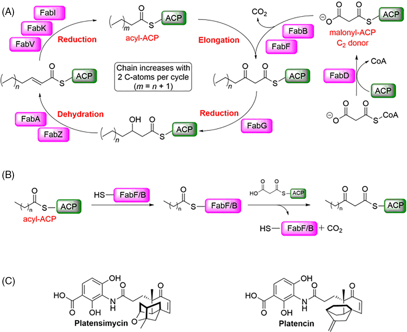 A) Schematic overview of the elongation part of the FAS II pathway. B) Condensation reaction catalysed by FabF/B. (ACP: acyl carrier protein). C) Platensimycin and platencin have been reported as dual FabF/B inhibitors.
