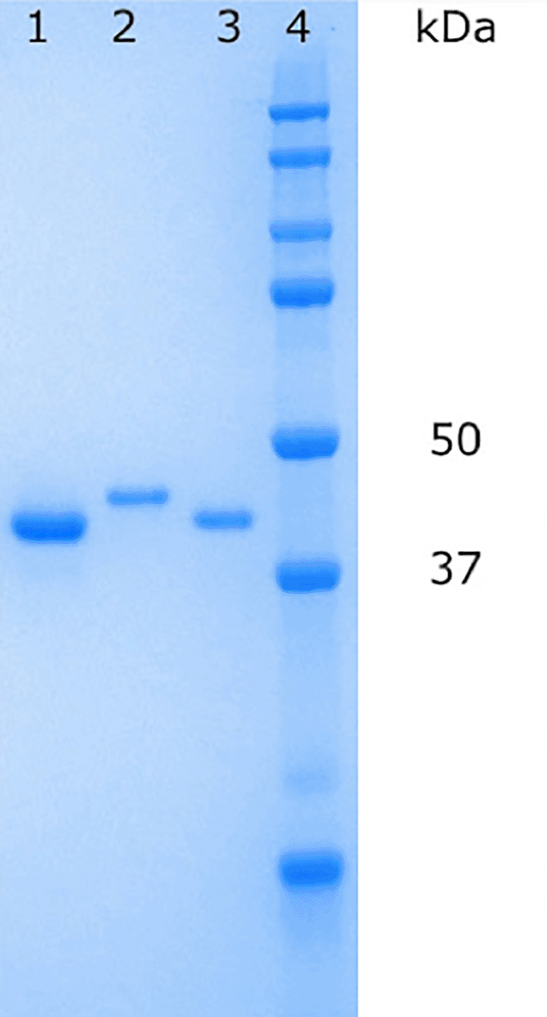 E.coli Rosetta (DE3) pLysS competent cells yielded the highest protein expression, based on SDS-PAGE analysis, and were used as an expression system for large-scale protein production and purification. Transformed cells were inoculated in 50 mL of LB medium supplemented with kanamycin (30 μg/mL) and chloramphenicol (50 μg/mL) overnight at 310 K. Pre-culture stocks were prepared by mixing the overnight culture with glycerol (final concentration 40% v/v), aliquoted and kept in –80 °C until use. For large-scale expression, 0.1 mL of pre-culture stock was inoculated in 100 mL of LB medium supplemented with kanamycin (30 μg/mL) and chloramphenicol (50 μg/mL) overnight at 310 K. The entire volume was then transferred into 900 mL of LB-medium containing antibiotics and the cell growth continued until OD600 reached 0.7. Protein expression was then induced by adding IPTG to a final concentration of 1 mM and the expression continued for another 3-3.5 hours.