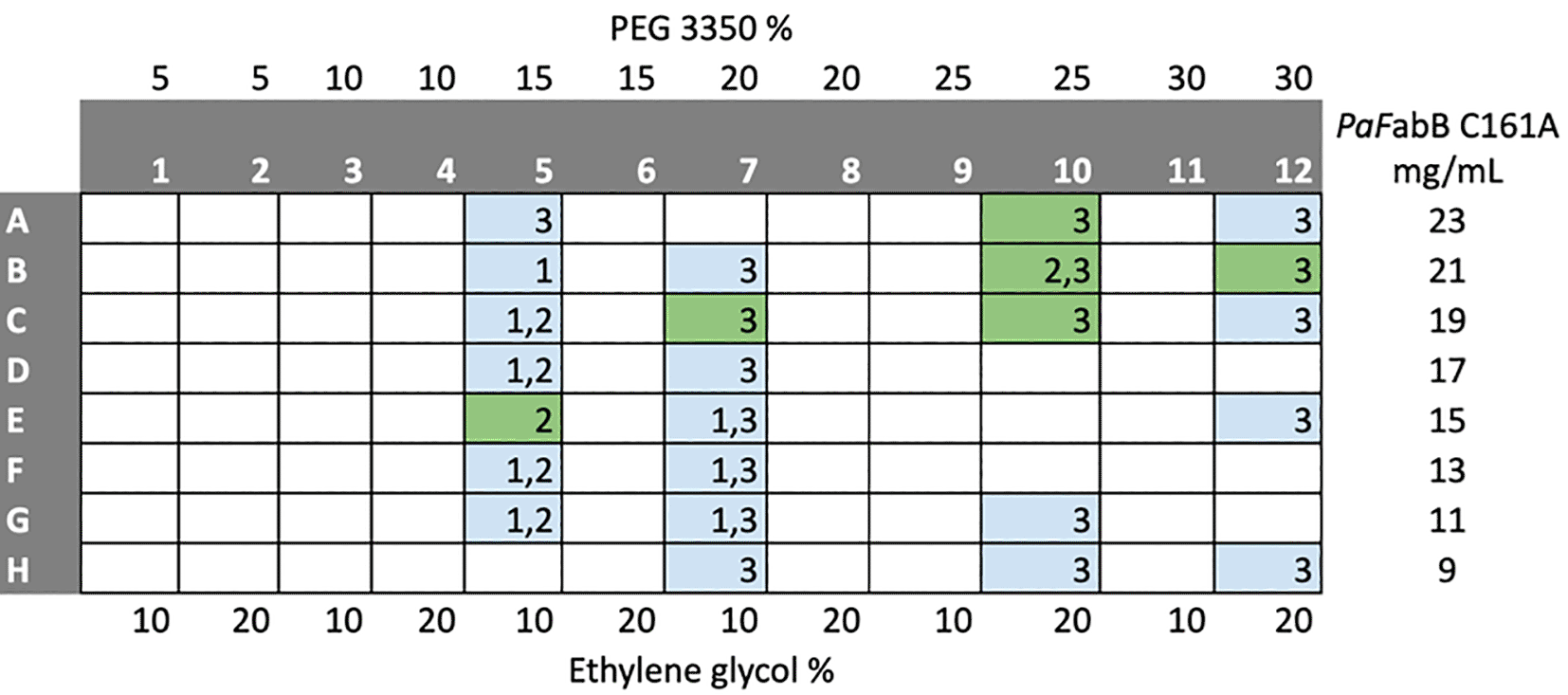 The numbers in the cells indicate the ratio between protein solution and crystallization buffer in the drops (drop 1-1:1 ratio, drop 2-1:2 ratio, drop 3-2:1 ratio). Coloured cells indicate conditions from which crystal were harvested and mounted for diffraction experiments. Green cells indicate conditions under which diffracting crystals were obtained.