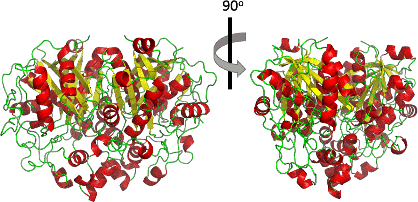 Beta sheets and alpha helices are shown in yellow and red colour respectively while loops are shown in green.