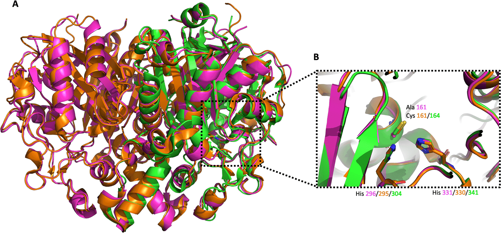A) The three different enzymes are shown in orange, green and magenta cartoon style, respectively. B) Alignment of the active site catalytic triad of VcFabB, w. t. PaFabF and PaFabB C161A.