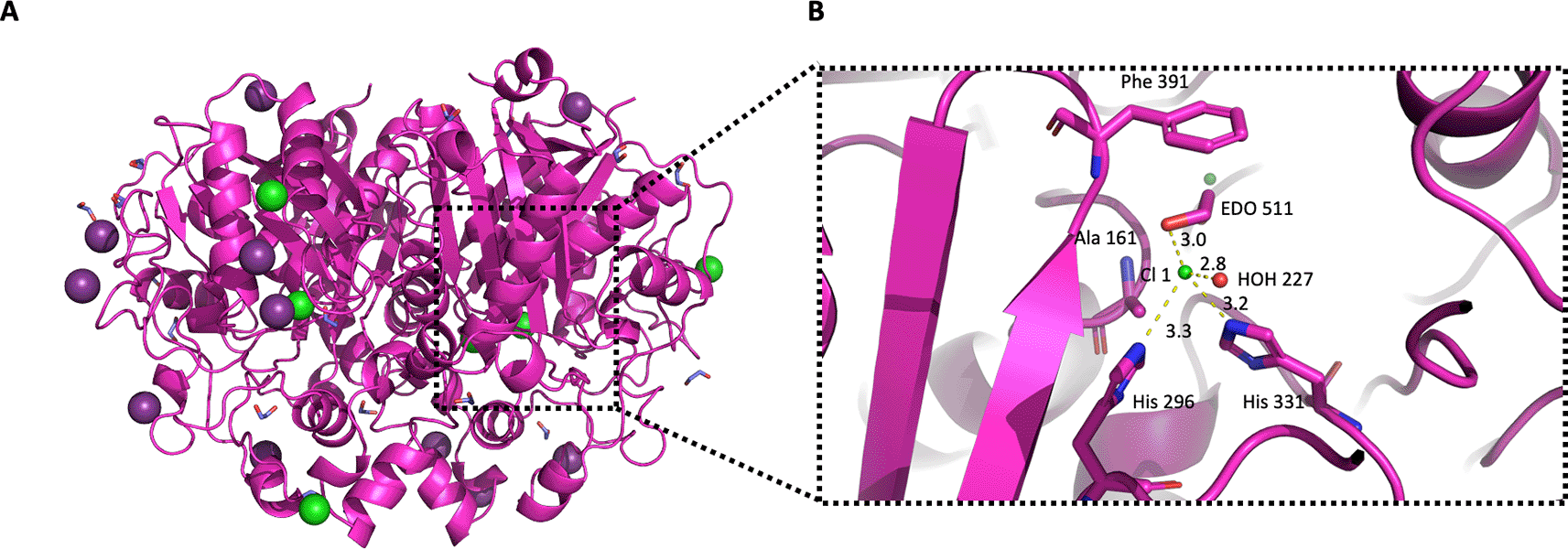 A) The structure of PaFabB is shown as magenta cartoon style. Iodine and chloride ions are shown with deep purple and green colour respectively. B) Active site residues are shown as magenta sticks, water molecules and chloride ions are shown as red and green spheres, respectively, while the distances between the chloride ion Cl 1 and the neighbouring molecules are shown as yellow dashed lines.
