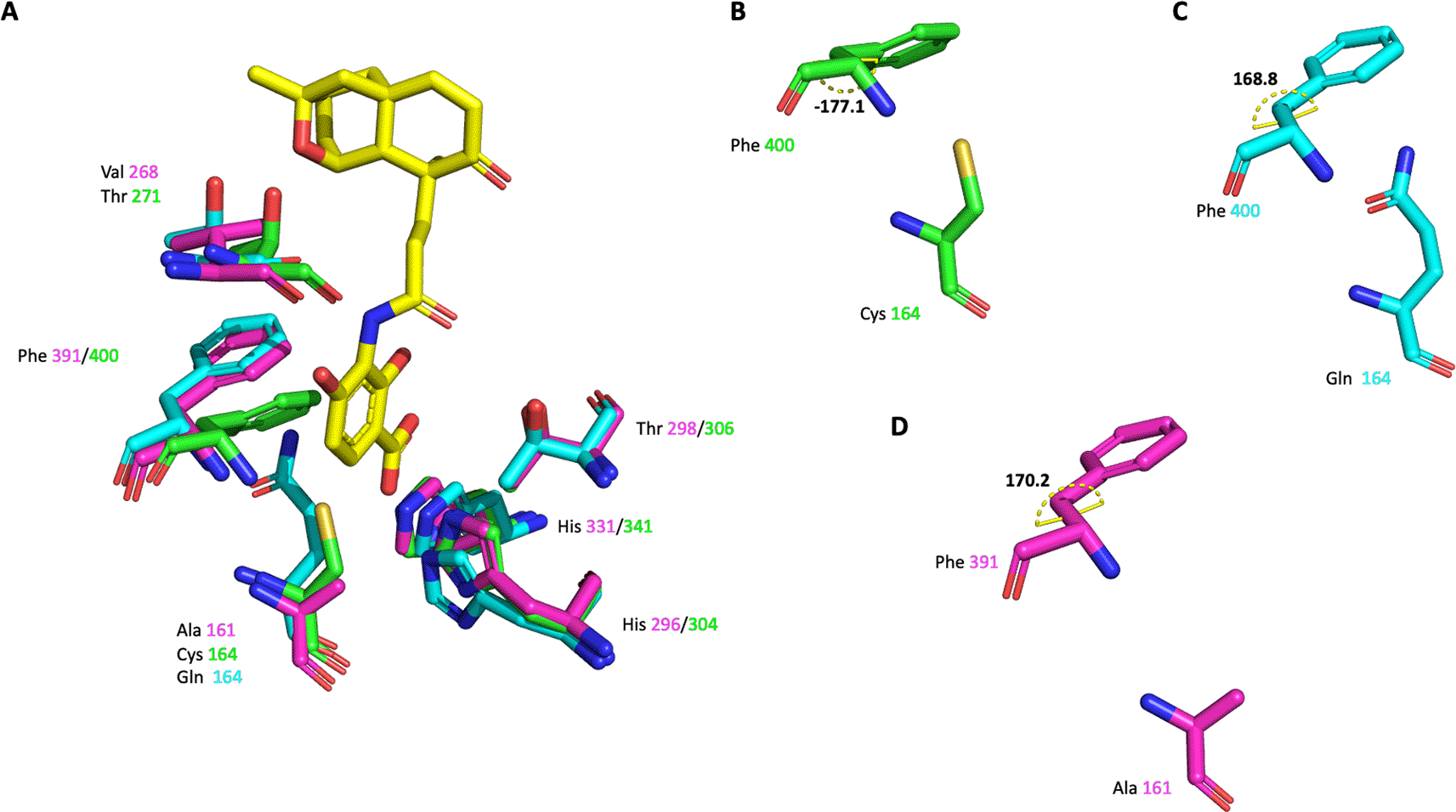 A) The active site residues of the three different enzymes are shown as green, cyan and magenta sticks, respectively. Platensimycin binding to PaFabF C164Q (PDB Id 7OC1) is shown as yellow sticks. Side chain conformation and dihedral angle C-CA-CB-CG of Phe391/400 is shown in B) for PaFabF C) for PaFabF C164Q and D) for PaFabB C161A.