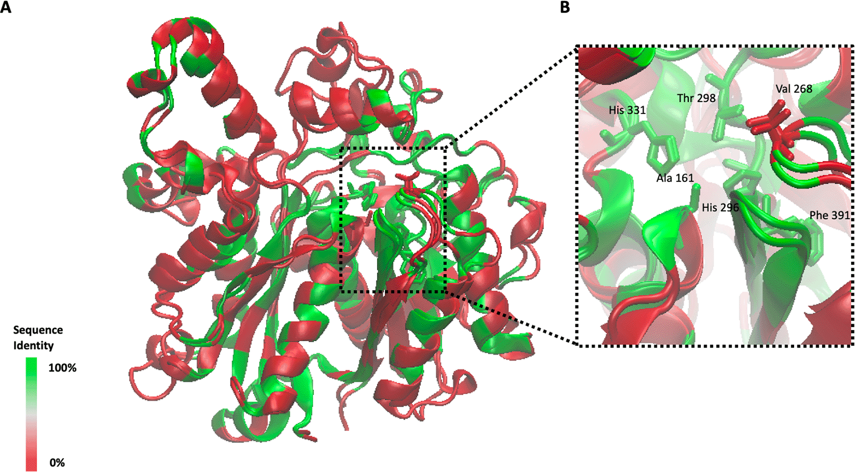 A) Alignment between chain A of PaFabF and PaFabB C161A is shown as cartoon style and color-coded based on the sequence identity between the two isoenzymes. B) Zoom in showing the active site and active site residues. Residue labels and numbering are based on PaFabB only.