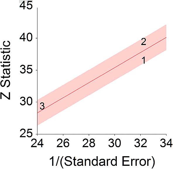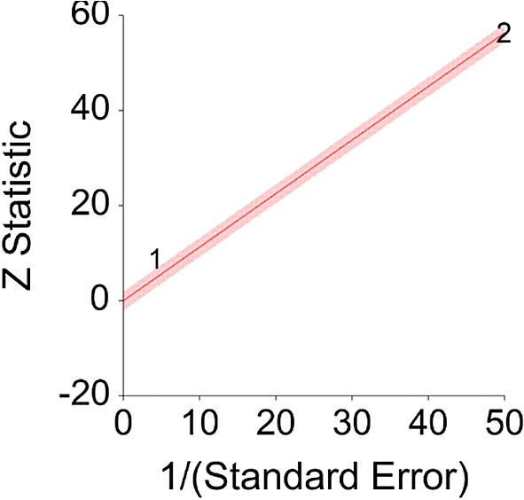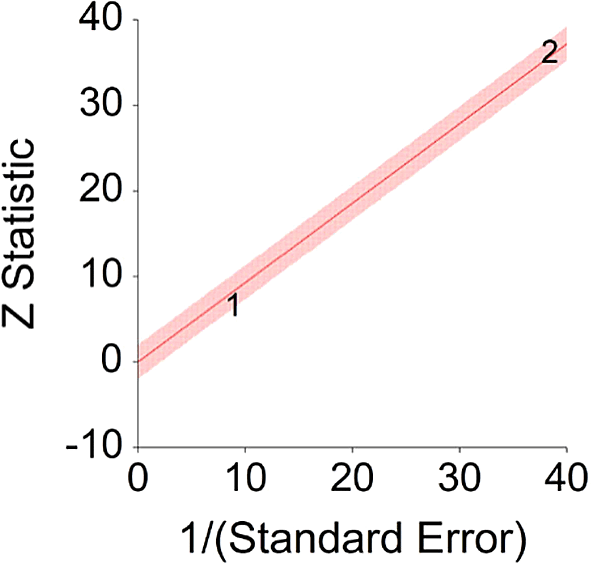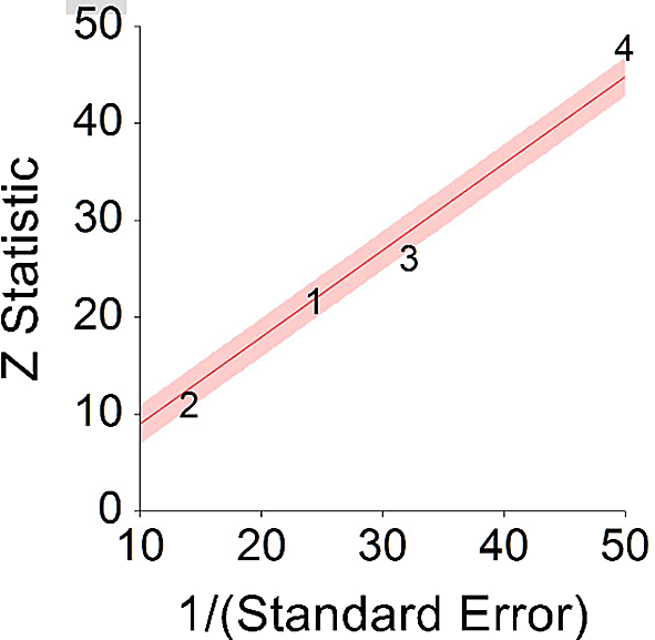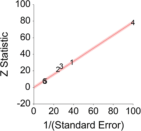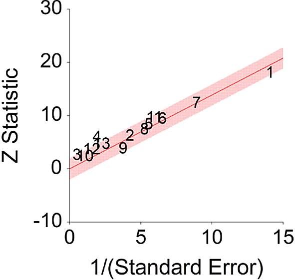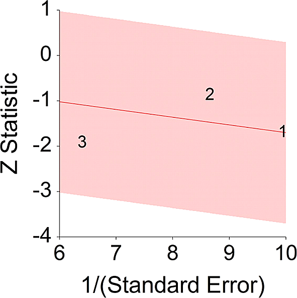 Z Statistic, standardized score that indicates a higher probability for a significant result; Hazard ratio (log), the ratio of the hazard rates corresponding to the conditions described by two levels of an explanatory variable that explain the outcome in survival analysis; Forest plot, a graphical display of estimated results from a number of scientific studies addressing the same correlation in a meta-analysis. The forest plot depicts the relationship between an independent variable and the outcome across several similar correlations; Radial plot, a graphical display of heterogeneity in the data in a meta-analytic context. For a fixed-effects model, the plot shows the inverse of the standard errors (1/standard error) on the horizontal axis against the observed effect sizes or outcomes standardized by their corresponding standard errors on the vertical axis