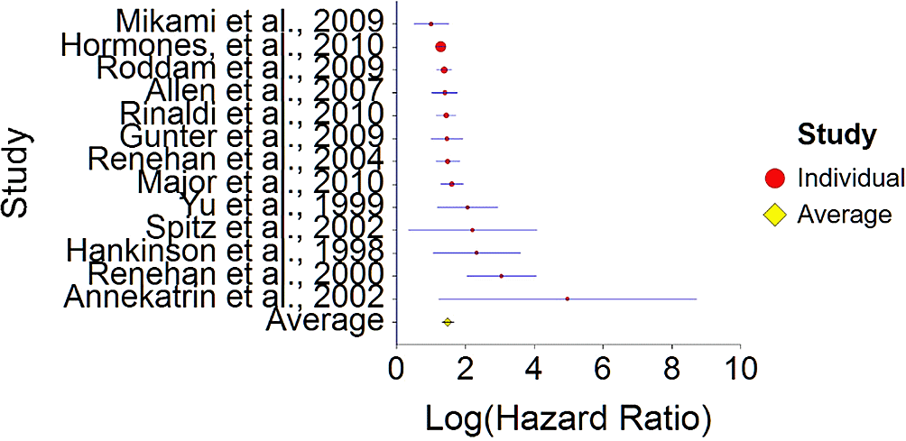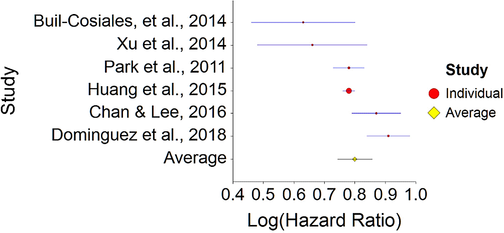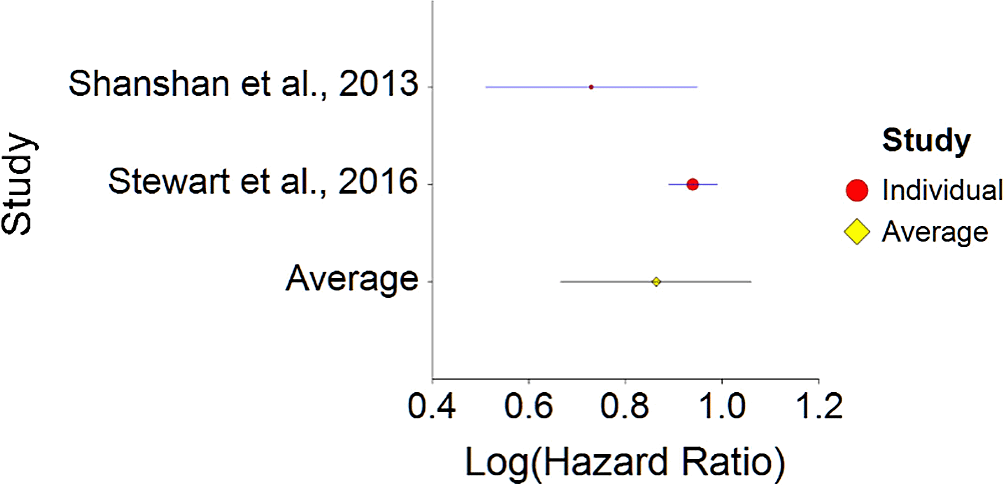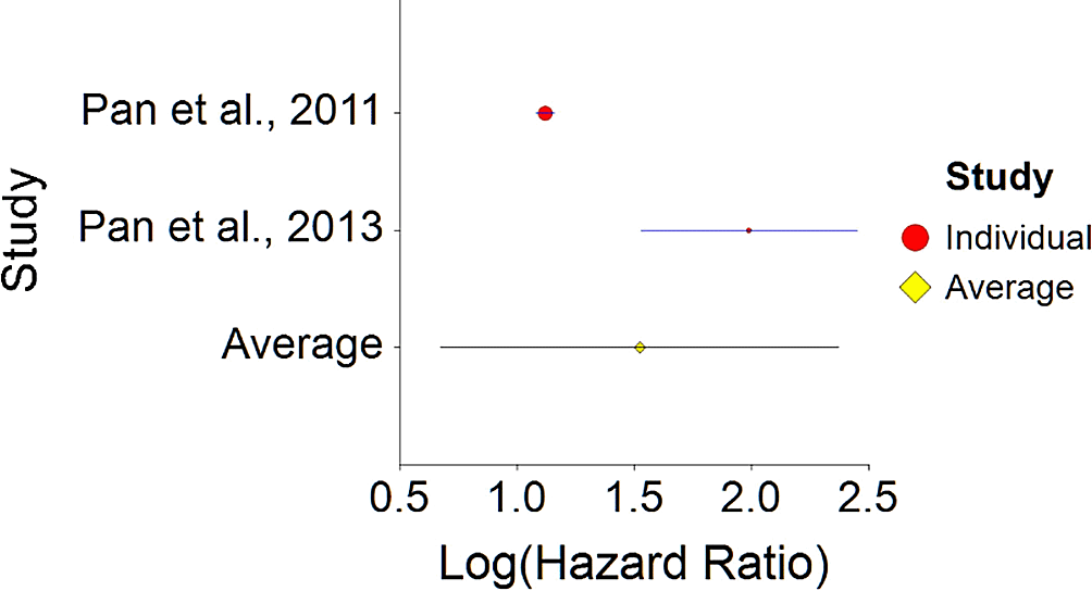 The results were calculated using NCSS 2019 software which has a statistical package for calculating aggregated hazard ratio (HR). The input included individual HR from each study, variance for each HR (calculated as SE2, and SE (standard error that was calculated manually using CI with the following calculation: