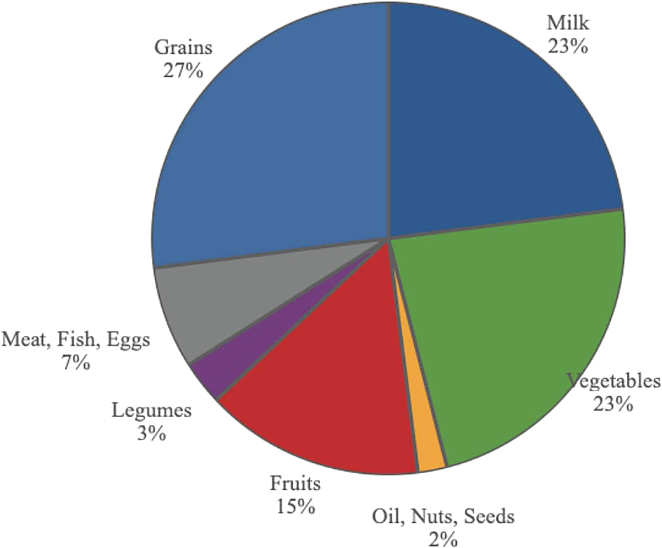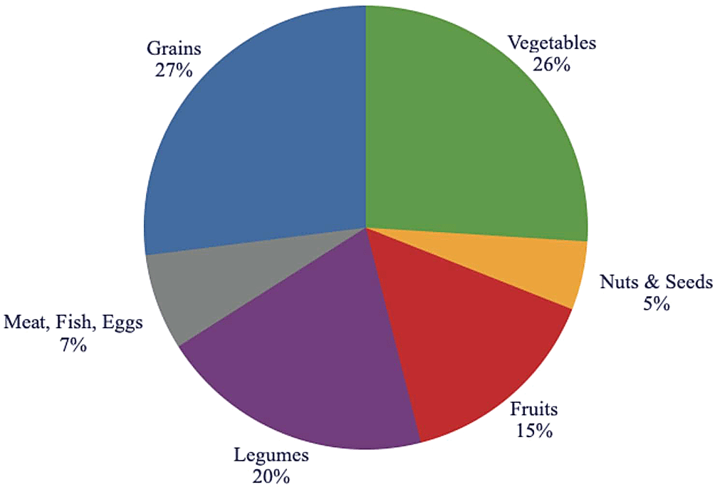 • vegetables (26%), highlighting a variety of dark green vegetables, as well as root vegetables.