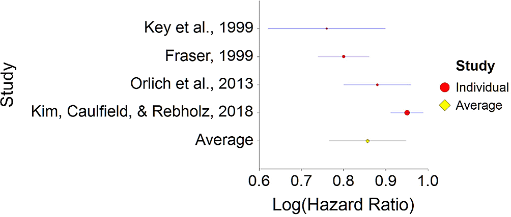 To conclude, a high fiber diet significantly decreases death probability by about 20% on average, in comparison with non-fiber diet. This effect size is in line with effect size received by Yang et al.155 (HR = 0.84), and by Kim & Je154 (HR = 0.77).