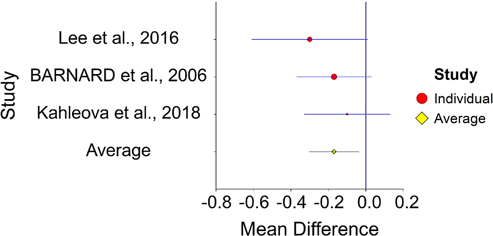 A significant heterogeneity was found between studies, meaning that the studies included in this analysis were different by several methodological aspects which could bias the aggregated HR effect, Q (3) = 20.70, p < 0.01. Differences between individual studies are significant and considered heterogeneous (see Figure 4, result of 4 - Kim, Caulfield, & Rebholz,147 exceeds CI borders), in this study among Seventh-day Adventists, vegetarians were healthier than non-vegetarians but this cannot be ascribed only to the absence of meat.