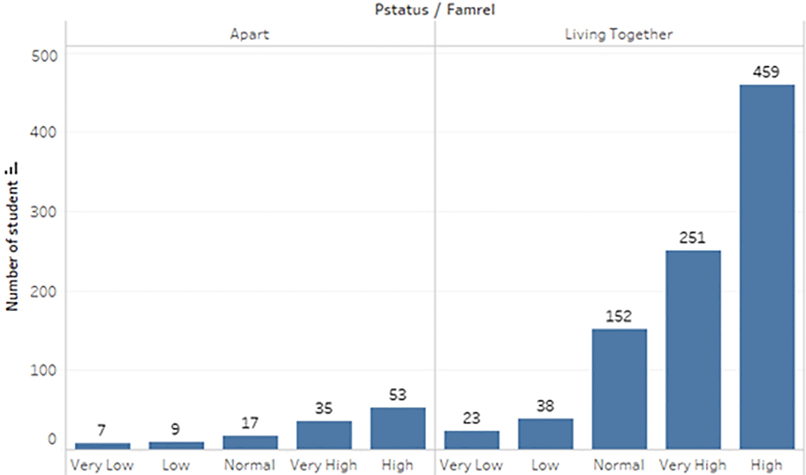 The dataset of student performance is taken from a population of two Portuguese secondary schools namely Gabriel Pereira Secondary School (395 students)14 and Mousinho da Silveira Secondary School (649 students).15 In the survey, the students were taking the subjects, Mathematics and Portuguese. The two datasets were combined and consisted of 1044 students’ personal data and scores for the two subjects. The datasets are visualizations and shown in Figures 2 to 6.