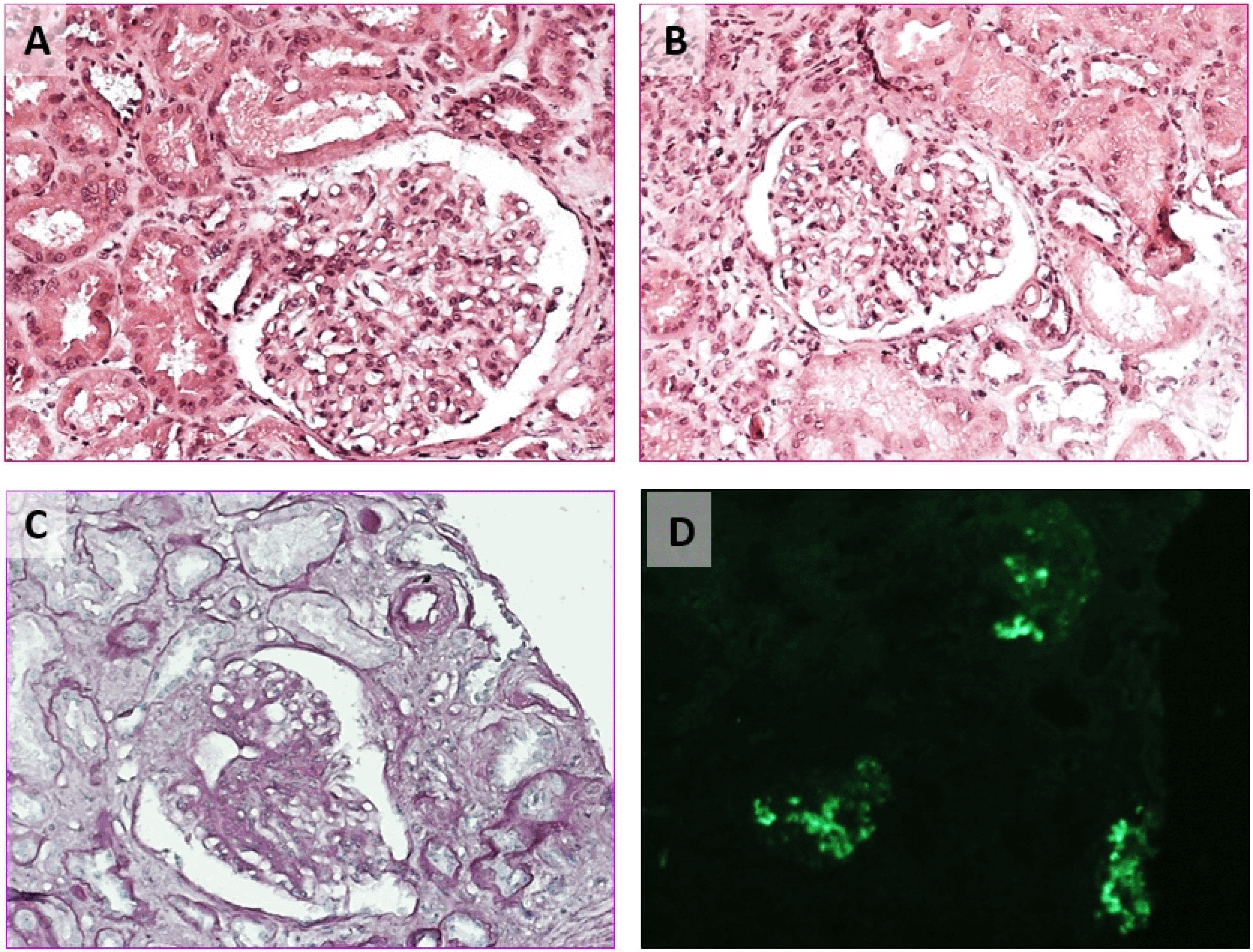 A,B: Light microscopic, hematoxylin and eosin- stained (×200), segmental mesangial hypercellularity. C: Light microscopic, Periodic Acid Schiff (× 200), flocculo-capsular synechiae. D: Immunofluorescence microscopy (×200), Mesangial IgA deposits.
