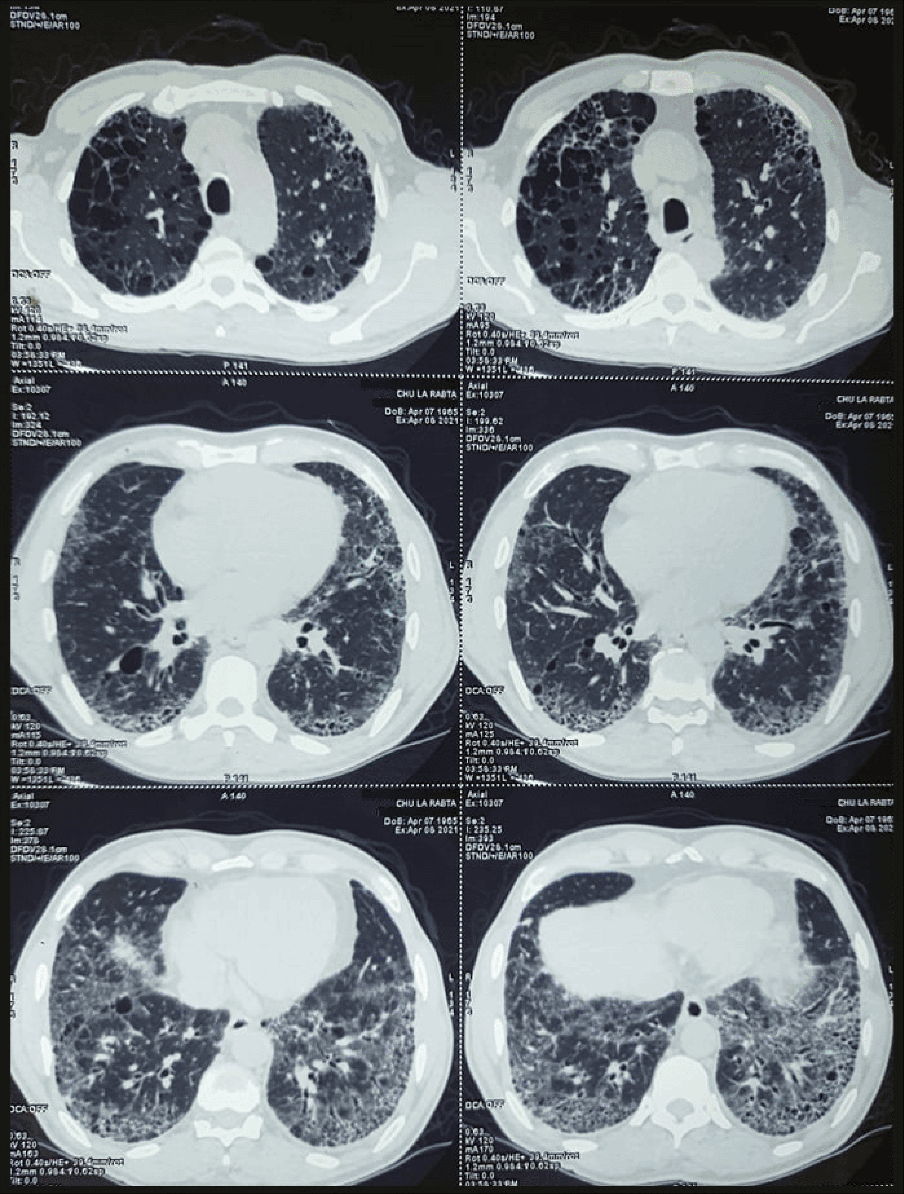 Chest tomography was performed and it revealed fibrosing diffuse interstitial lung disease consisting of bilateral septal thickening, ground-glass opacities and a honeycomb pattern. These aspects predominated at the two bases and on the periphery (Figure 2).