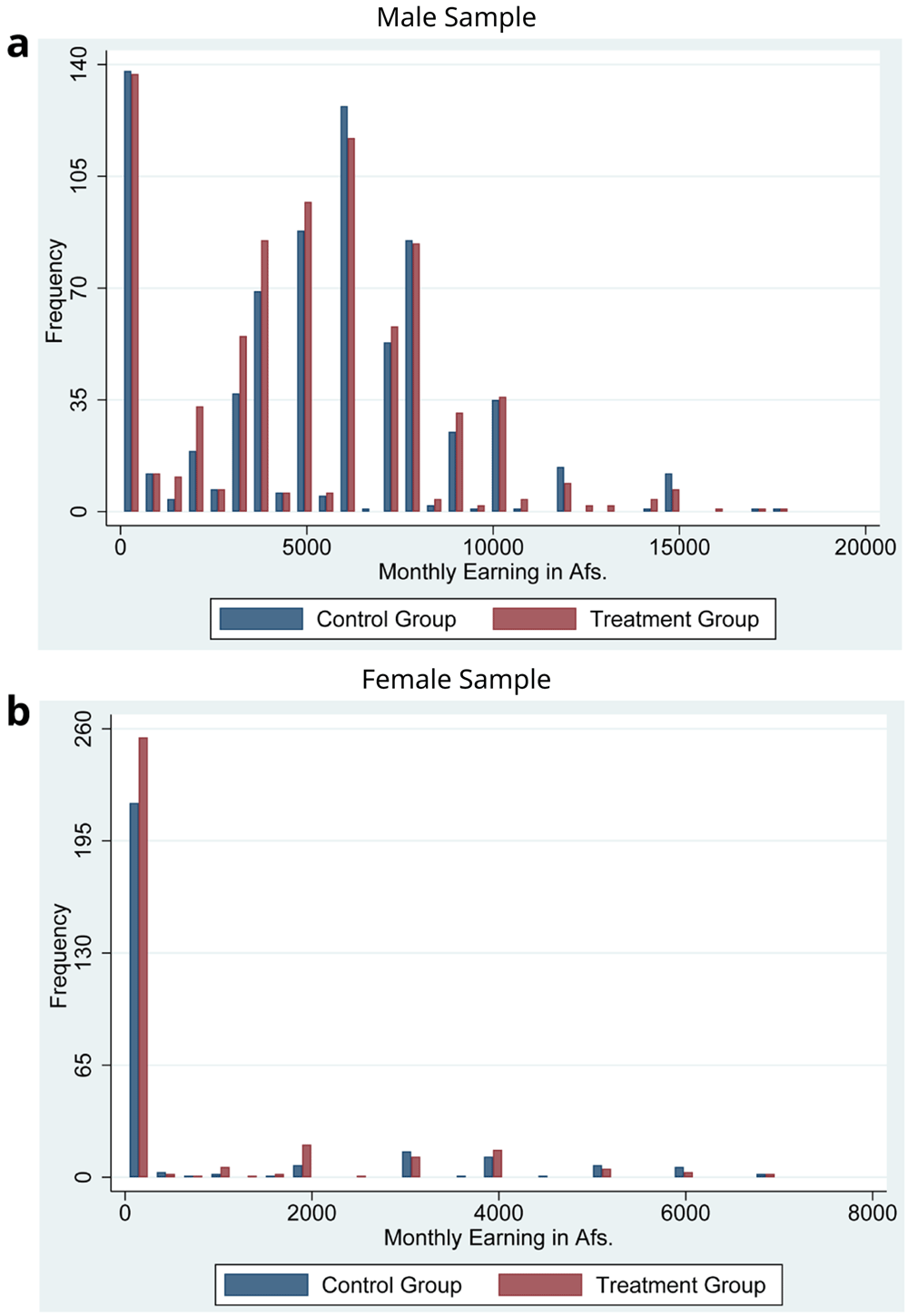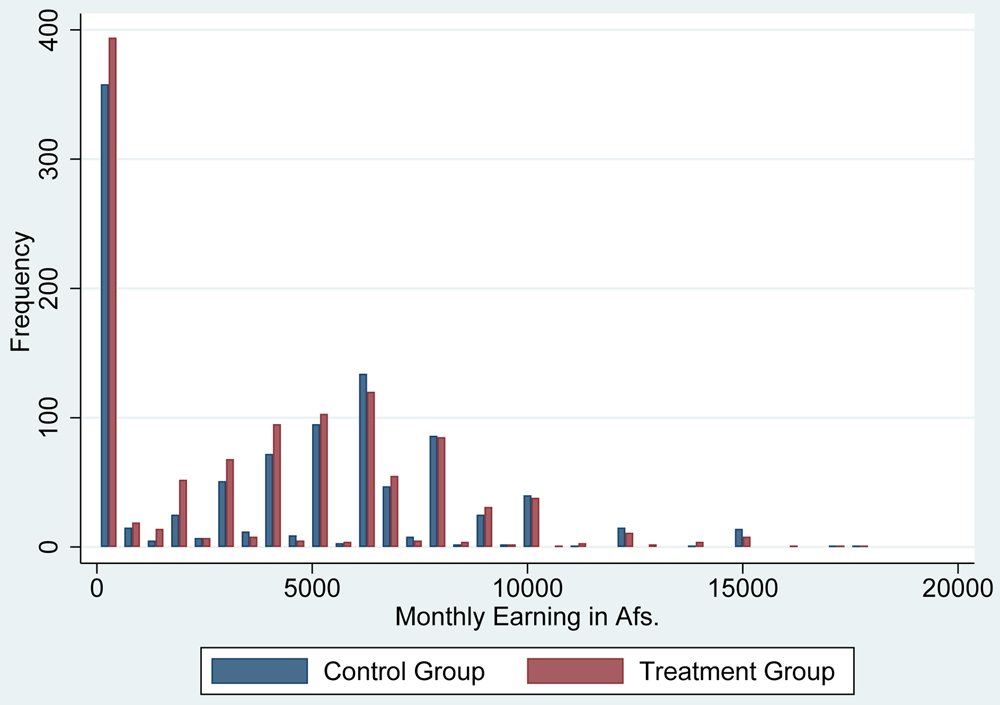 Figure 2 shows the histogram of monthly income for those who had received cash grants and those who had not at baseline. According to estimates by the National Statistical Office in a 2016–2017 study, the poverty line threshold was 2,064 Afs per person per month (Islamic Republic of Afghanistan Central Statistics Organization, 2018). Thus, the average income in our study sample was two times higher than the income at the poverty line. However, as shown in Figure 2, a substantial percentage of the population had zero income. Figure 2 also shows that the distribution of income was quite similar between those who received cash grants and those who did not.