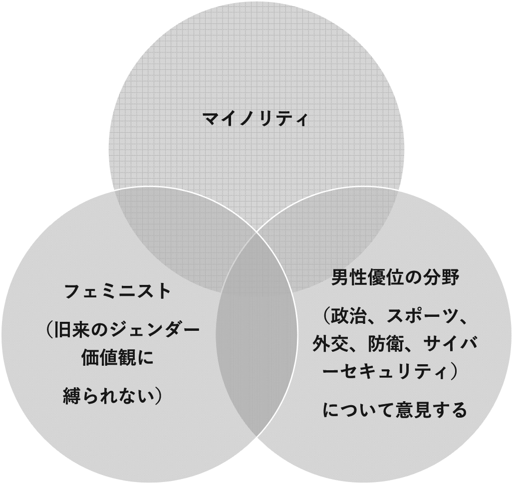 場合、ハラスメントの標的になりやすく、これらの属性の共通部分においては最もハラスメントに遭う確率が高くなる(図 1)。なお、欧州の調査では、女性議員の 58.2%が SNS 上でオンライン・ハラスメントを受けたことがあると返答したが、特に年齢の低さ(40歳以下)、次に野党党員であることなど、議会政治において少数派である側面がハラスメントに遭うリスクを高めるとの結果であった (Inter-Parliamentary Union, 2018; 申・濱田, 2021)。