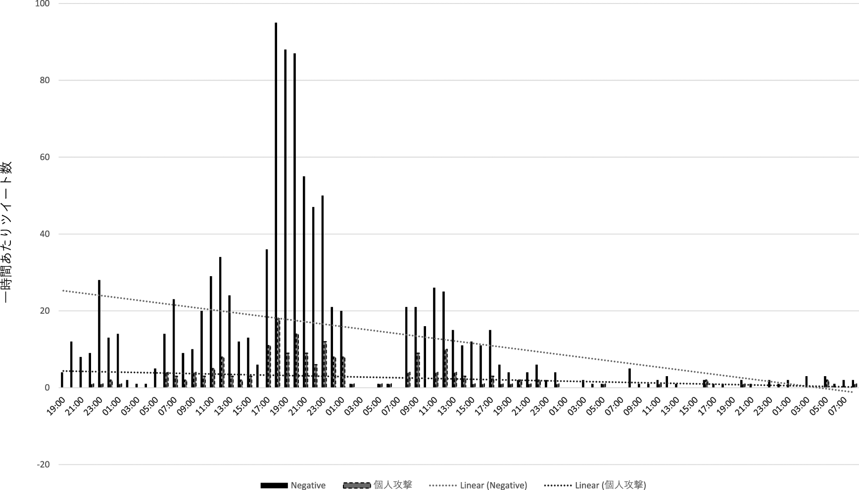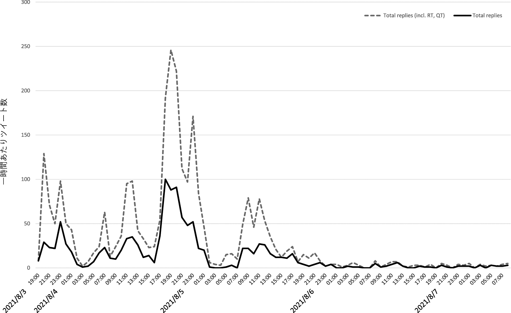なお、直接リプライを中心に分析を行うのは、仮に引用RTが拡散されても、被引用ユーザーには通知が届かず、静観できる状況であるものの、被引用ユーザーに対して直接リプライ、もしくは引用 RT がなされると、本人に通知が届き、とりわけそのコメントが被引用ユーザー本人のアイデンティティ等、元ツイートの内容以外について批判的なコメントであった場合、ハラスメント行為に直面することとなり、精神的苦痛が大きいためである。