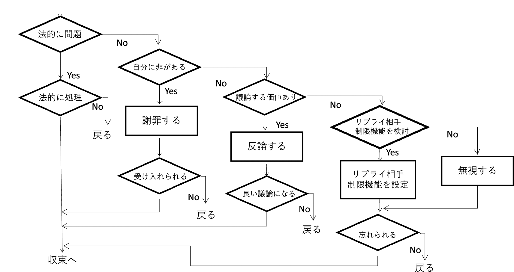 組織ができる対策として、まずは炎上決着メカニズムを理解することが不可欠である。田代・折田 (2012) は、ネット炎上を「不具合」に対して決着をつけようとすること、と見なし、炎上が収束するためには「決着」が必要とした。そして、ハラスメントが収束するためには攻撃側が納得することが必要であり、法的に問題があれば法的に処理されることで収束に向かう(図 13)。謝罪を行ったとしても、単に謝罪しただけでは収束せず、謝罪が受け入れられて収束する。炎上が議論へ繋がって収束する、コメント欄やブログそのものの削除 (Twitter の場合はリプライ機能の制限や Twitter アカウントの削除)、炎上を無視し、忘れ去られることで収束を迎えることもある、とする。所属員の SNS アカウントが万が一炎上したり、ハラスメントの被害者となった場合、そうした行為を受けたことを批判したり懲罰の対象とするのではなく、収束には様々なパターンがあることを理解することが、SNS 運用者支援の第一歩であろう。