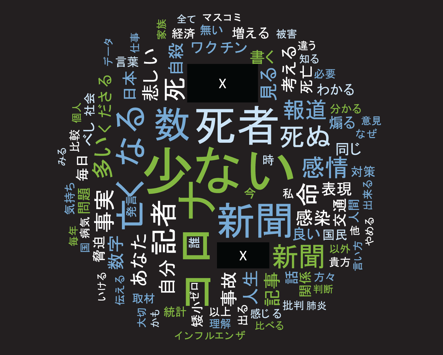 さらにツイートを手動で分類したところ、1,175 件の直接リプライのうち、肯定的な内容は 147 件、批判的な内容は 1,022 件となっていた。また、同ソフトを使用してワードクラウドを作成したものが、図 5 である。図からは、直接リプライを送った者は「日本における (新型) コロナ (ウイルス感染症)による死者数は少ない」という旨を主張していることが分かる。