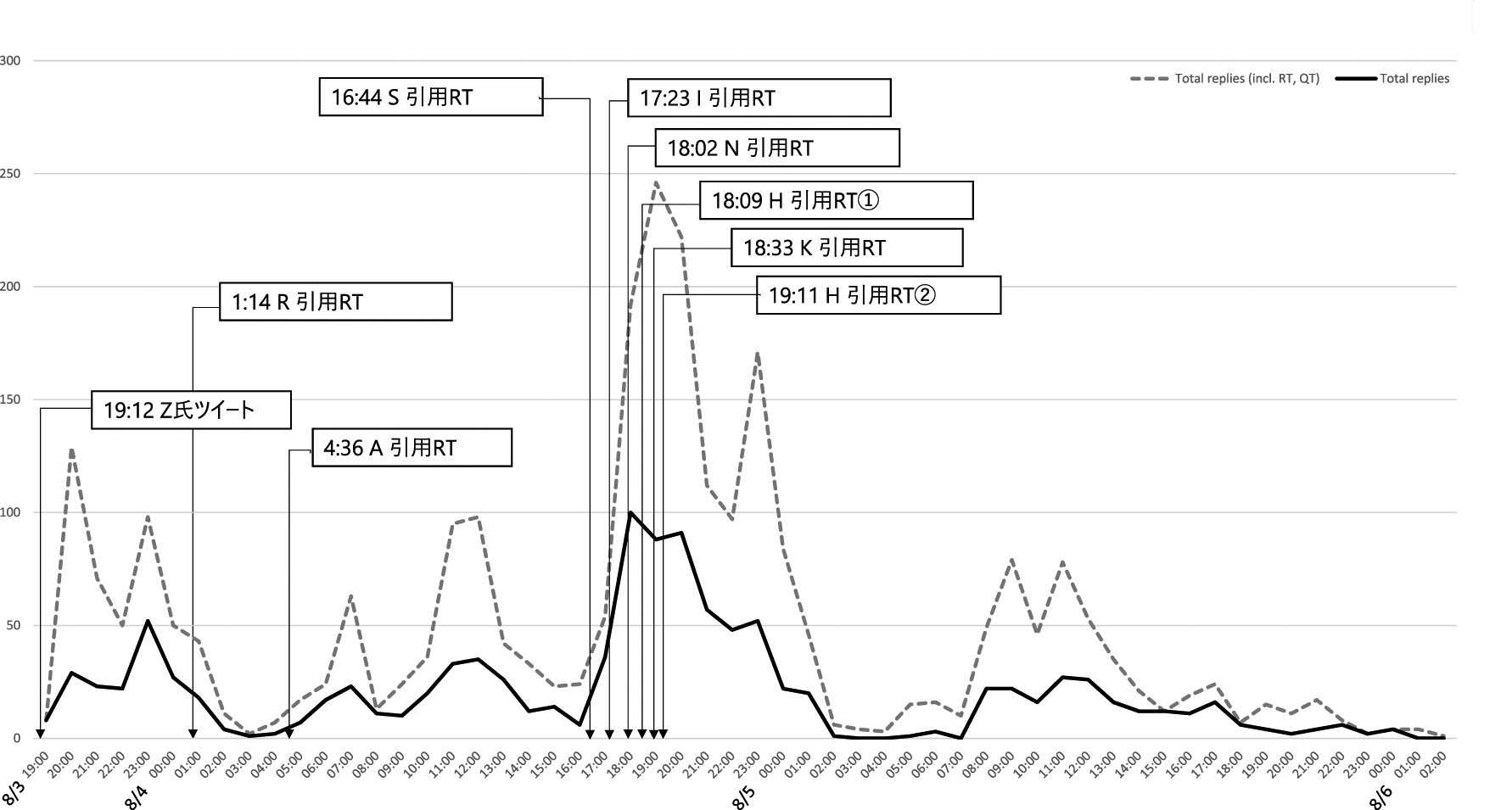 本ツイートは掲載後、約 3 日間にわたり批判的なツイートが集中し、炎上状態となった。本稿では、2021年 8 月 3 日 〜7 日の間にZ氏アカウントに直接届いた 2,817 件の直接リプライ(直接リプライ1,175 件、これらのリツイート1,499 件、引用リツイート143 件)、及び 5,595 件の本ツイートの引用リツイート(以下引用 RT)の分析を行った。データ分析対象ツイートは、ExportData.io サービスを利用し、(to:[Z 氏のアカウントID]) until: 2021-08-07 since: 2021-08-03 および Query: https://twitter.com/[Z氏のアカウントID]/status/1422500544032038919, Result type: mixed, Language: ja で 2021 年 8 月 7 日に取得した。なお、同等の機能を果たす無料の代替品には、Twitter の公式 API (https://developer.twitter.com/en/products/twitter-api、ないしhttps://developer.twitter.com/en/docs/twitter-api/tools-and-libraries) がある。