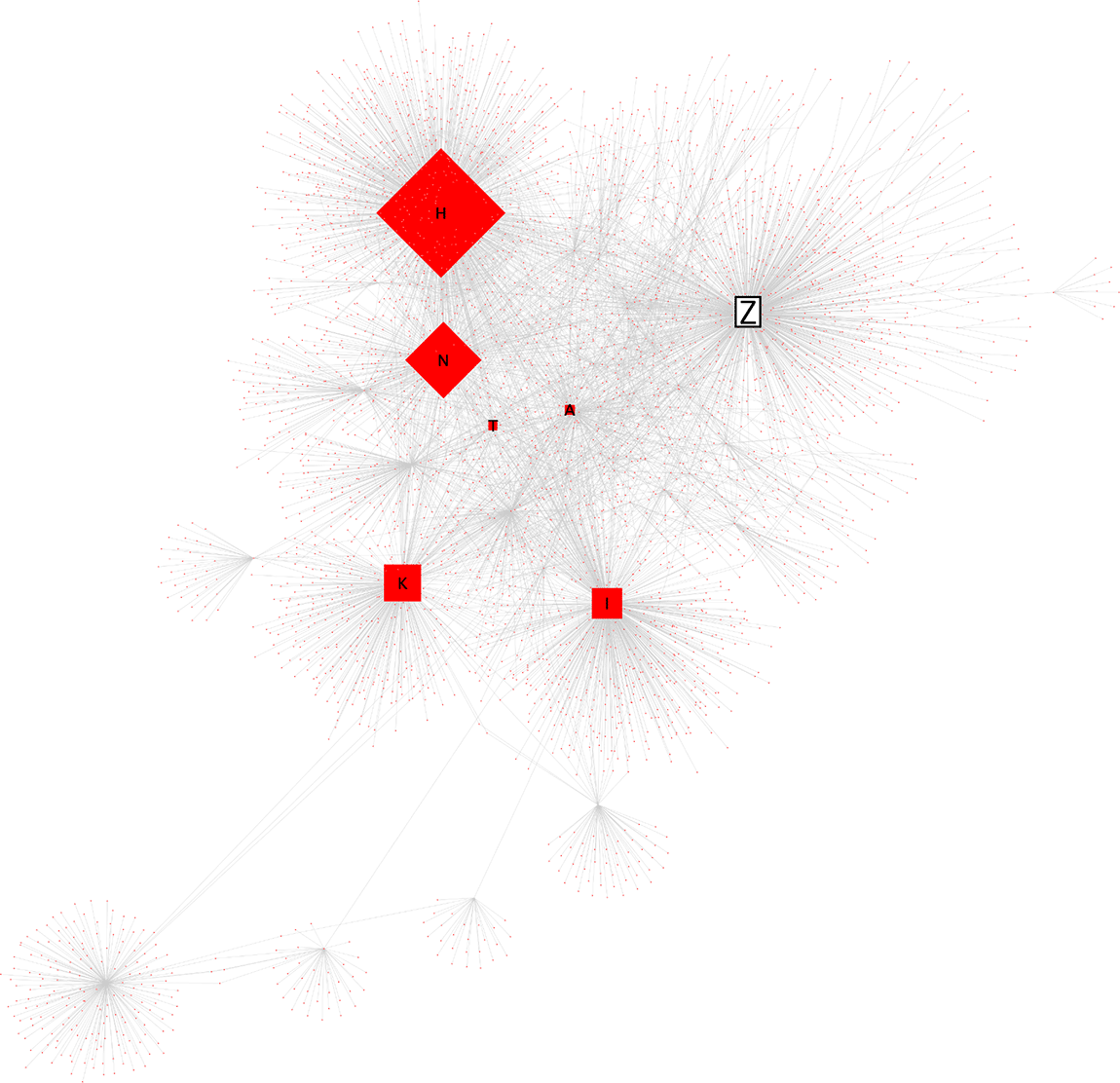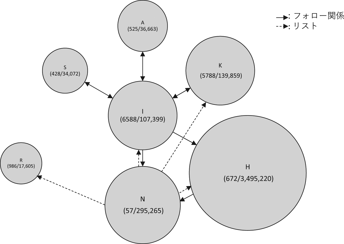 小山ら(2019) による計約 13 万人の炎上参加ユーザーの分析によれば、炎上参加者は他の炎上にも参加しやすいことが明らかになっている。5 件以上の炎上に関わったユーザー77 名に関する詳細な分析においては、それらのユーザー間にはフォロー/フォロワー関係が密に存在し、高頻度炎上関与ユーザーは多くのフォロワー数を持ち、同じ炎上トピックに対してツイートを行うという、情報の共振構造が確認できたという。Z氏の炎上事件においても、多くのフォロワー数を持ち、特定の政治傾向を持つユーザーが、フォロー/フォロワー関係を結び、ユーザー間でZ氏のツイートの引用RTを順次行っていた(図 6, 図 7)。これらユーザー群が他の炎上に関わっていたかは本稿では確認できず、高頻度炎上関与ユーザー群とみなすことは難しいが、多くのフォロワー数を持つユーザーの引用 RT が、フォロワーを通じて広くTwitter 全般に拡散されていったことが推測できる(図 8)。