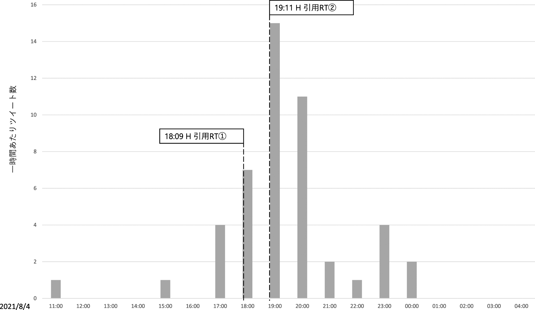 直接リプライの分析からは、インフルエンサー、及びインフルエンサーの呼びかけに直接・間接的に反応したと推測されるユーザーとは別に、③荒らし (扇情的なコメントやヘイトスピーチを繰り返し投稿すること)を行うユーザー群が見て取れた。まず、195 件の個人攻撃のツイートのうち、12 名のユーザーが 2 度以上、繰り返し個人攻撃のリプライをZ氏に送っていた。また、図 10、図 11 は批判的な内容の直接リプライ、及び個人攻撃のリプライの一時間あたりの数をグラフ化したものであるが、両者の数量は必ずしも呼応していない。特に一時間あたりの個人攻撃コメントが多かった時間帯(2021 年 8 月 4 日午前 11 時 〜8 月 5 日午前 2 時)について、先のインフルエンサーの犬笛に呼応した批判的ツイートの一時間あたり数と比較すると、特に増減傾向に類似性が見られない(図 12)。これらから推測されるのは、常日頃から Z 氏の発言をモニターし、期を見て荒らしを行うユーザー群が存在する可能性である。実際、自称メディアウォッチャーで7千余のフォロワーを持つユーザーが、2021 年 3 月 18 日に、X社には一部、低質かつイデオロギー色の強い記者がいる、という内容のツイートを行い、X 社の「低品質」記者一覧として、Z 氏ほか複数名の X 社に関係する記者の Twitter アカウント情報を掲載している。なお、こうしたユーザーが、Z 氏の他のツイートに対しても繰り返し荒らしを行っているか、またいかなる動機に基づいて荒らしを行っている・行ったのかはさらなる調査分析が必要である。