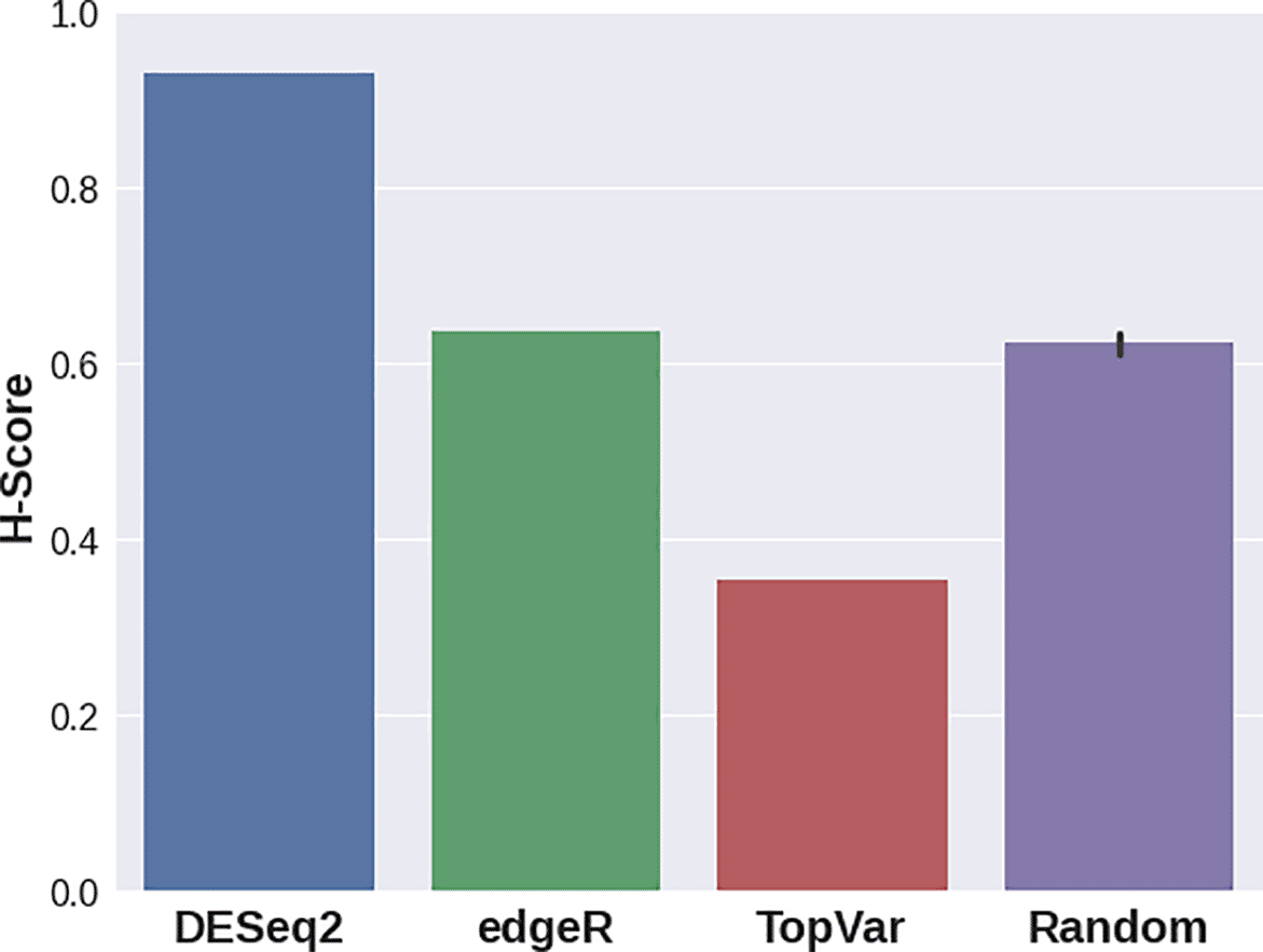 In the third case study, various DGE approaches resulted in gene sets that delivered significantly different H-scores (Figure 3). For this dataset, edgeR provided a signature with the best quality score, while DESeq2 still demonstrated a higher separation quality than that of random signatures. Genes with the highest variance showed lower scores compared to random gene sets. This result stresses the importance of the Hobotnica procedure to evaluate the quality of a particular DGE analysis.