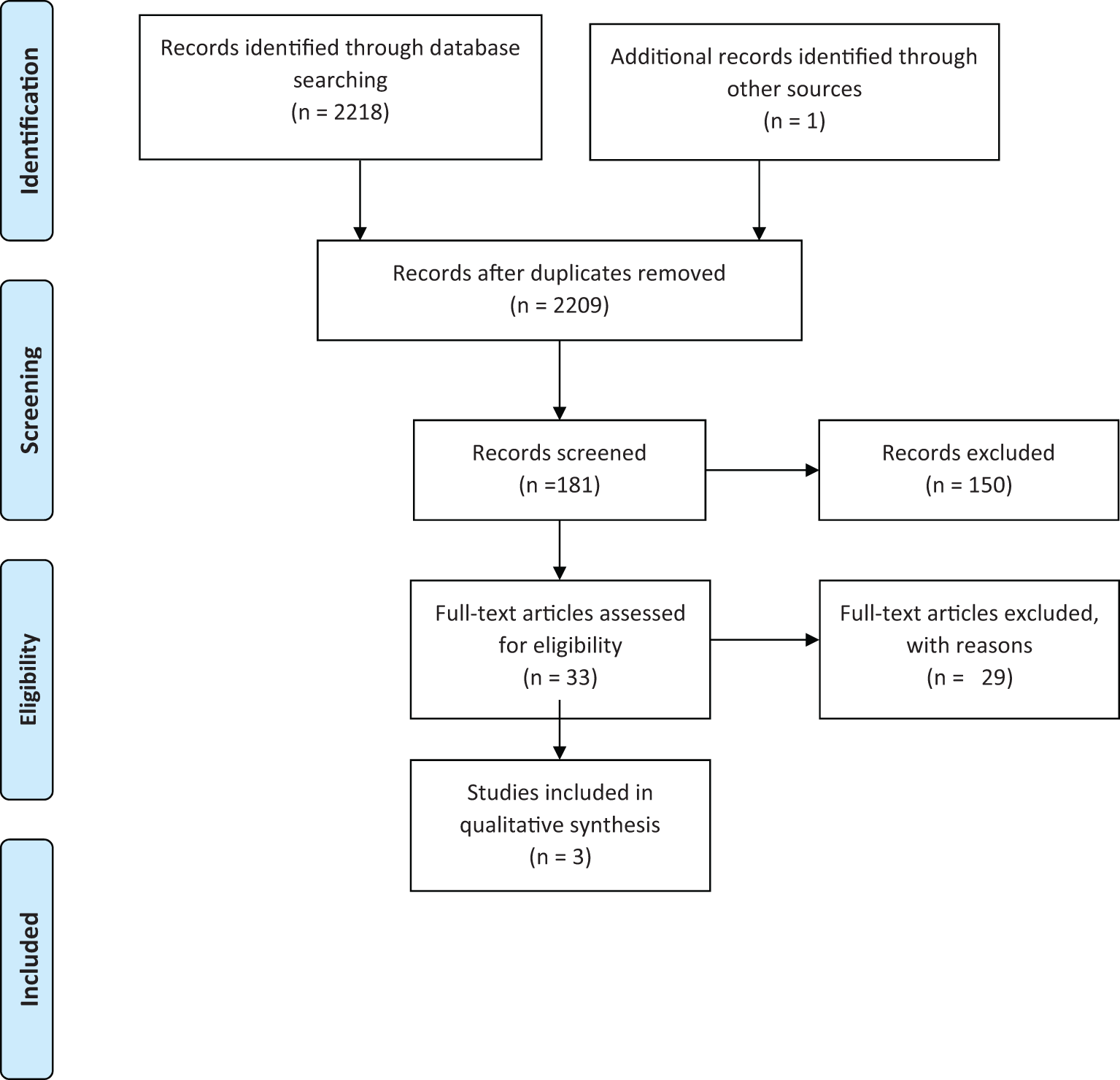 All the data retrieved from the databases, summing up to 2219 articles, were fed in the Mendeley Desktop v1.19.8 after which duplicates were removed. The articles were then screened through the titles and 181 articles were found eligible, following this the abstract screening removed 150 articles, after which full-text screening was done, and 29 papers were excluded, eventually yielding three papers that meet the inclusion criteria of this review. The PRISMA flow chart in Figure 1. Outlines details regarding the identification, screening, eligibility, and inclusion of the studies in this review.