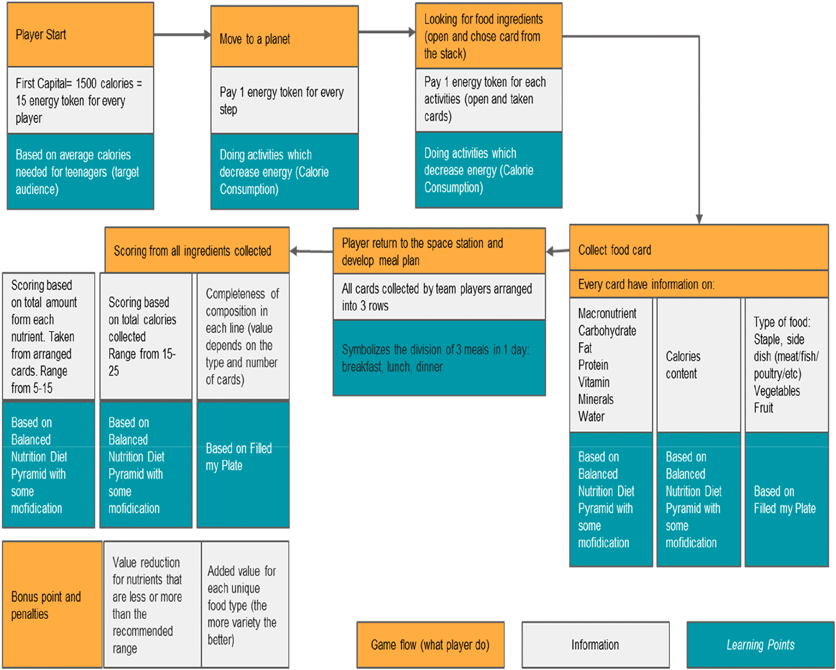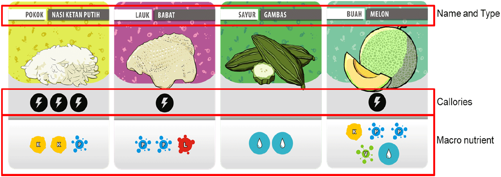 Behaviours that can last for life are usually gained during the childhood period.1–4 Knowledge delivery was the first and foremost step in bringing the children toward a balanced diet and healthy eating habits. Therefore, education about nutrition is essential to improve the quality of life and health for the children to have better adulthood. Whenever nutritional education and information are given to children, they can build their awareness in choosing healthy food. This study engages game-based learning/gamification design to ensure that participants learn essential information with motivation and engagement. This factor is significant in Learning.23