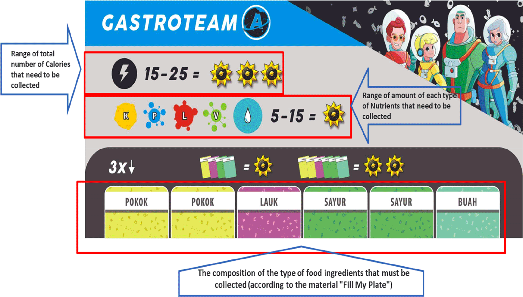 The main goal of our study was to develop the board game to deliver the contents of the campaign, mainly focusing on four pillars of a Balanced Nutrition Diet such as food types and suggested portions, hygiene, and the benefits of regular exercises. It also incorporated the food composition of My Filled Plate. The understanding needs to be appropriately delivered to children since children should consume the proper quantity and a variety of food for an adequate, healthy, and balanced diet. Based on the theme from the FGD, the game content focus aligned with an ongoing campaign that incorporated the national program Balanced Nutrition Diet Pyramid and a guidance campaign of My Filled Plate.20