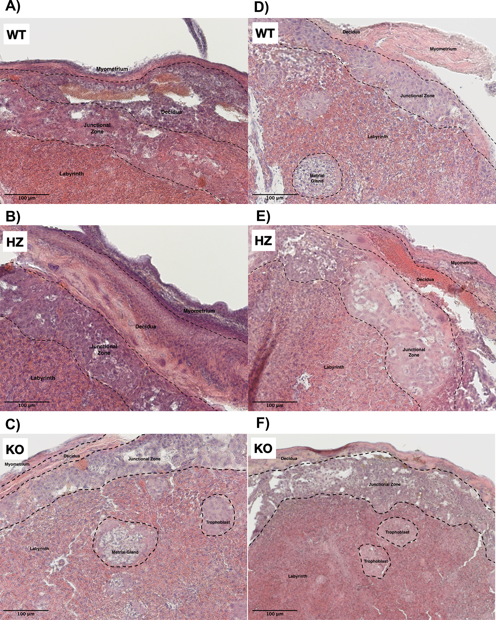 All images were analysed using the processing package ImageJ (National Institutes of Health, Maryland, USA) (RRID:SCR_003070). The area of the junctional zone of the placenta was evaluated according to the presence of trophoblasts in this placental zone. Three images were taken per sample of at least three individuals from each group and genotype.
