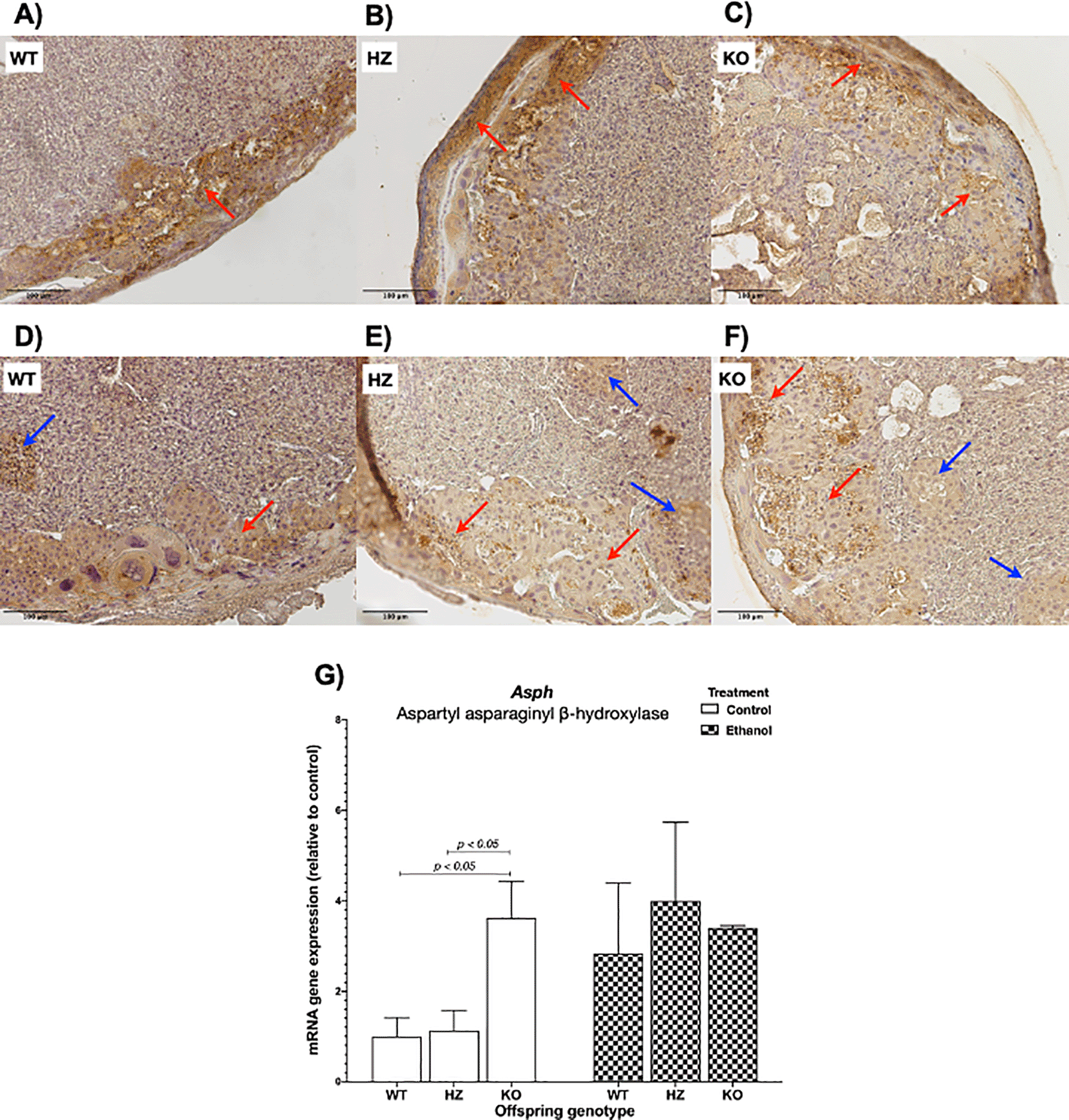 When Asph expression levels were evaluated, no significant differences were shown between both treatments (water or control, and ethanol). When grouped by genotype, a significant increase in Asph expression was observed in KO placentas compared to WT (p < 0.05) and HZ (p < 0.05) placentas from control group, whereas ethanol treatment seemed to have an increase effect in WT and HZ placentas (Figure 4G).