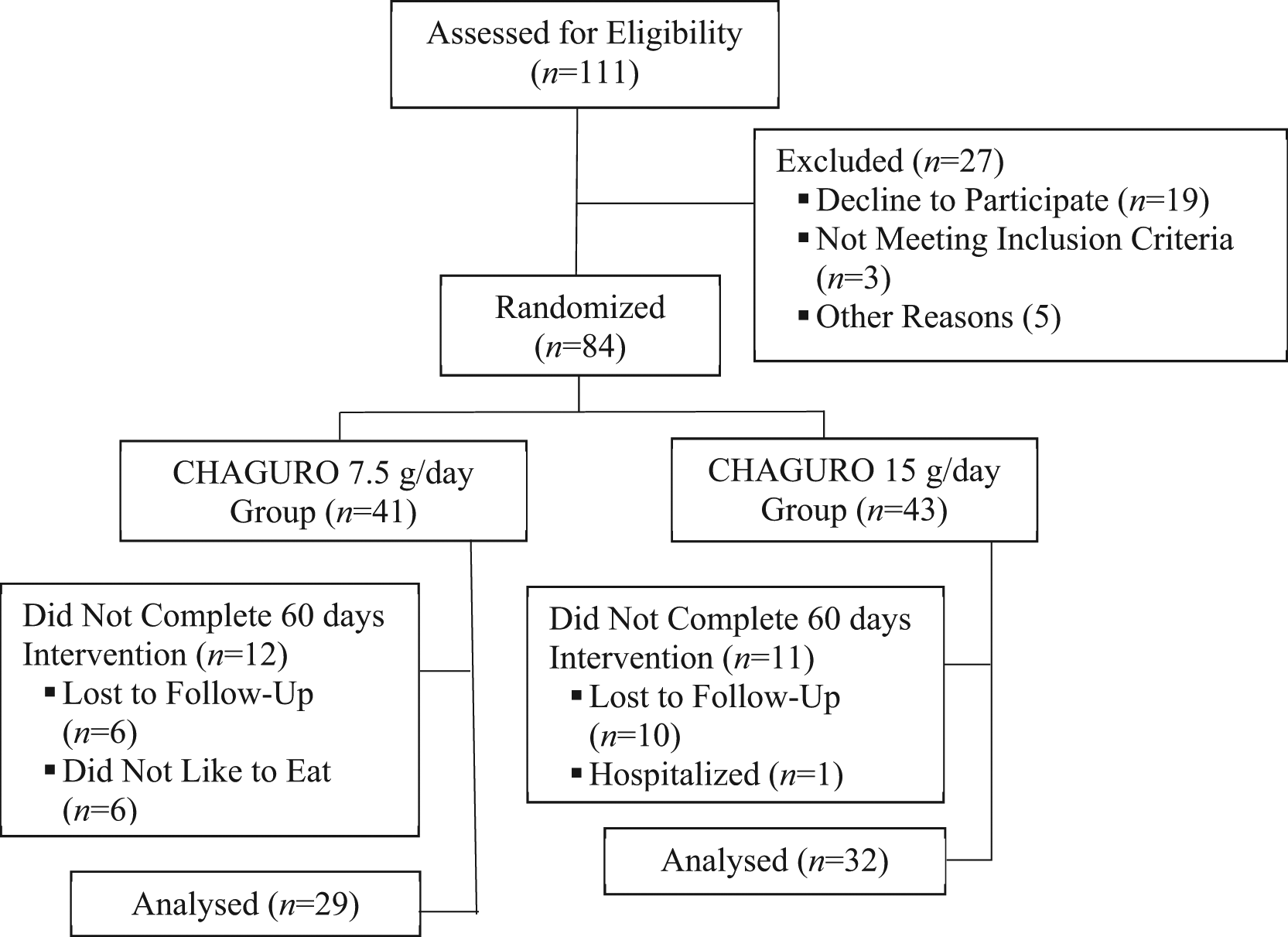 Exclusion criteria (Figure 1) included the following: respondents who were diagnosed with chronic diseases or took medications that affect HbA1c levels and blood lipids, women who were pregnant and/or breastfeeding or menopause. The dropout criteria were less than 80% compliance with CHAGURO products, experiencing dangerous conditions such as diarrhea or allergies, and the respondents died.