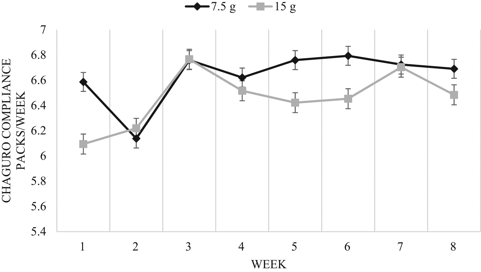 Dietary compliance was monitored through the number of CHAGURO packs consumed by respondents per week (Figure 2). The result showed that there were no significant differences in self-reported dietary compliance per week between both groups (p > 0.05).