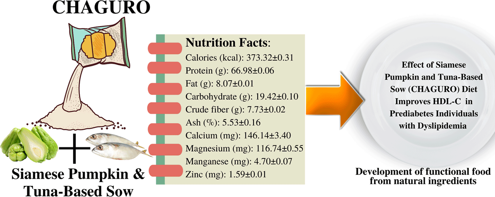 It can be concluded that the combination of siamese pumpkin and tuna has nutritional content that has the potential to improve the lipid profile and blood glucose so that it is protective against cardiovascular disease and type 2 DM. Therefore, this study tried to innovate both ingredients into functional foods in the form of powder as a diet for people with prediabetes and dyslipidemia. The study aimed to examine the effect of administering CHAGURO (a product name of a combination between siamese pumpkin and tuna-based powder) on serum levels of hemoglobin A1c (HbA1c), high-density lipoprotein cholesterol (HDL-C), and cholesterol/high-density lipoprotein (chol/HDL) ratio in prediabetes individuals with dyslipidemia.