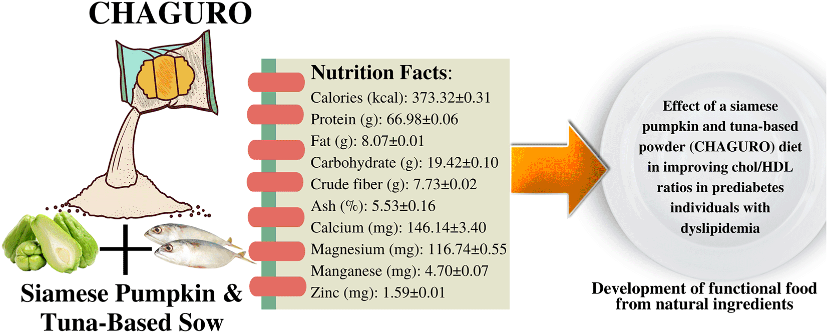 It can be concluded that the combination of siamese pumpkin and tuna has potential nutritional content with protective against cardiovascular disease and type 2 DM. Therefore, this study tried to innovate both ingredients into functional foods in the form of powder as a diet for people with prediabetes and dyslipidemia. The study aimed to examine the effect of administering CHAGURO (a product name of a combination between siamese pumpkin and tuna-based powder) on serum levels of hemoglobin A1c (HbA1c), high-density lipoprotein cholesterol (HDL-C), and cholesterol/high-density lipoprotein (chol/HDL) ratio in prediabetes individuals with dyslipidemia.