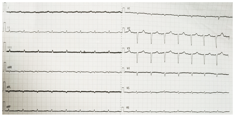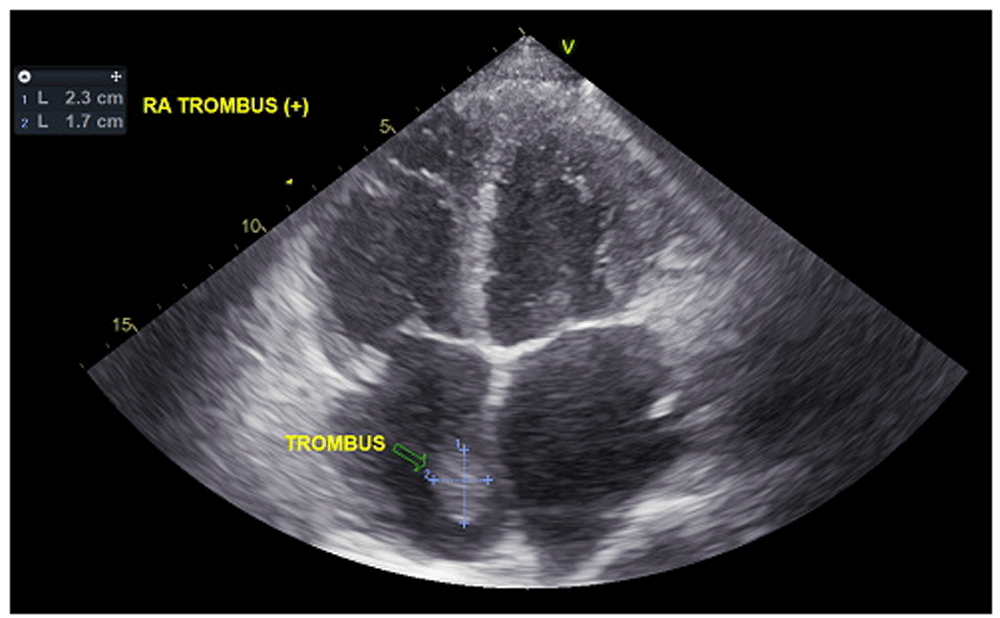 In the course of the assessments, no clinical, laboratory, or radiological signs of pulmonary tuberculosis were found. Eventually, the patient was transferred to the cardiology ward with the assessment of dilated cardiomyopathy + acute decompensated heart failure + deep vein thrombosis of the right and left inferior limbs + right atrial thrombus + pulmonary embolism + type II diabetes mellitus. During three days of treatment, the patient received 20 mg of Furosemide by intravenous injection every eight hours, Spironolactone 50 mg once daily orally, Ramipril 5 mg once daily orally, low-dose Bisoprolol started at 1.25 mg once daily orally, subcutaneous injection of Enoxaparin 60 mg every twelve hours, and subcutaneous injection of 6 units insulin aspart three times daily before meals. However, in the course of this treatment in the cardiology ward, the patient suddenly complained of shortness of breath accompanied by chest pain and cold sweat. His blood pressure became 60/40 mmHg, heart rate 110 bpm, and respiratory rate 28–30/minute, thus showing hemodynamic instability and shock. Therefore, he was reassessed as having high risk acute pulmonary embolism, and the patient was transferred to the cardiovascular care unit (CVCU) for observation and reperfusion therapy.